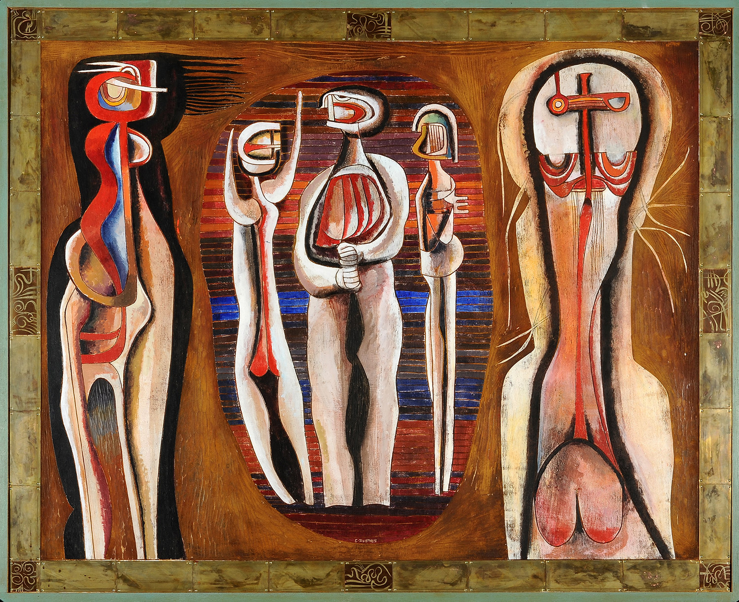His early use of the medium of woodcutting soon translated into a focus on the block itself. Instead of cutting the block and then using it as a means to an end – the print – he began to colour and shape the blocks, using them as a surface for paint and dry pigment. He also began to work on murals, and carried out many public commissions in this medium.