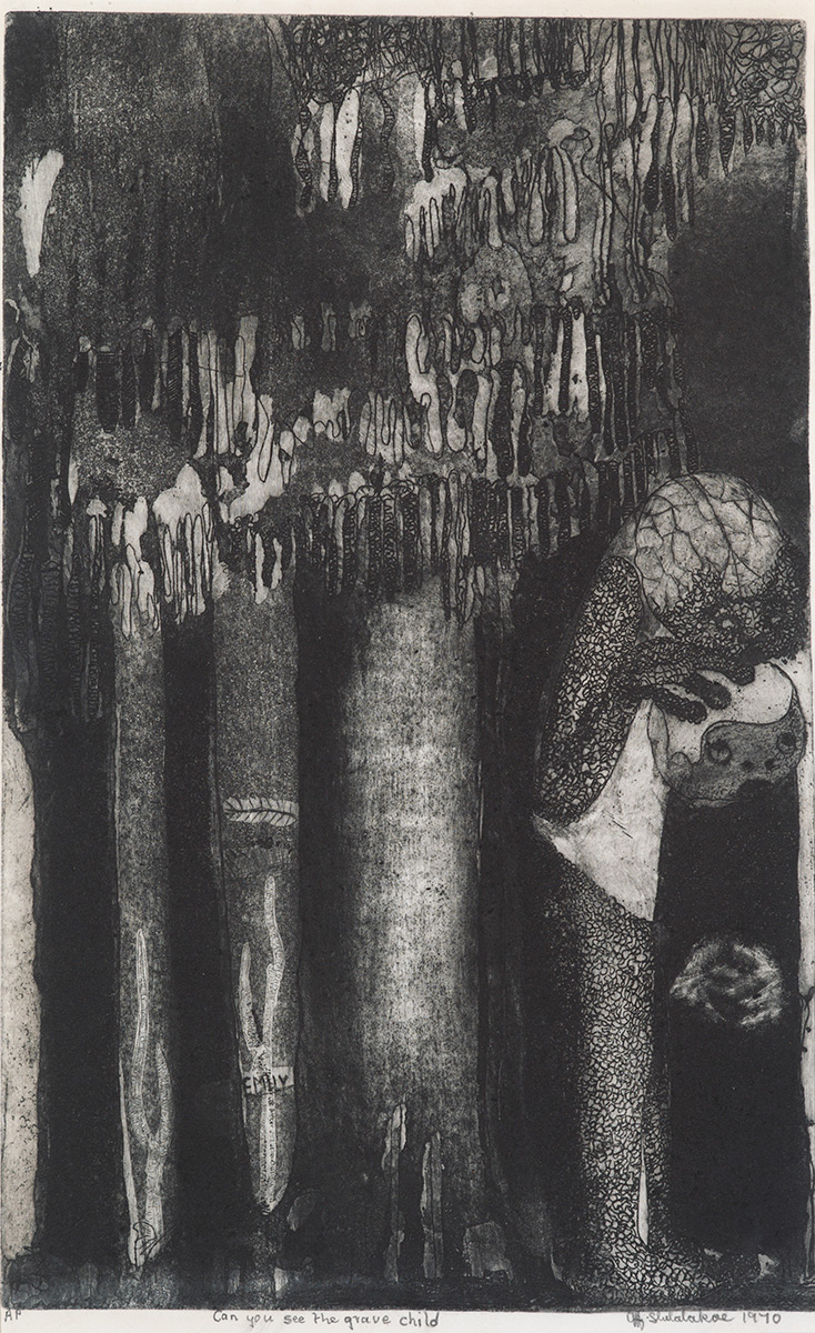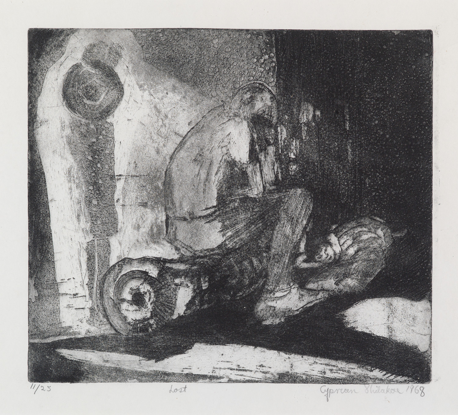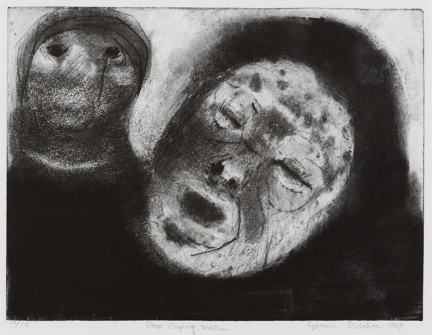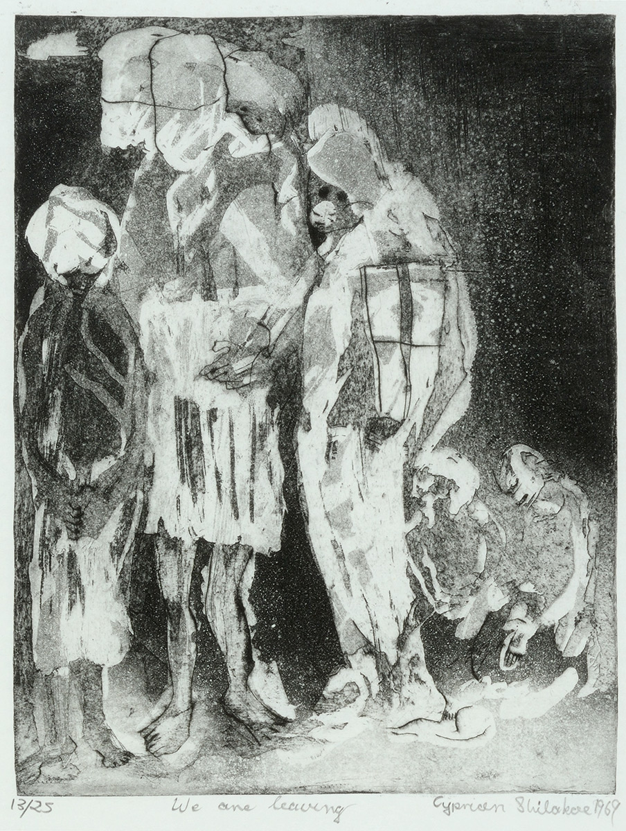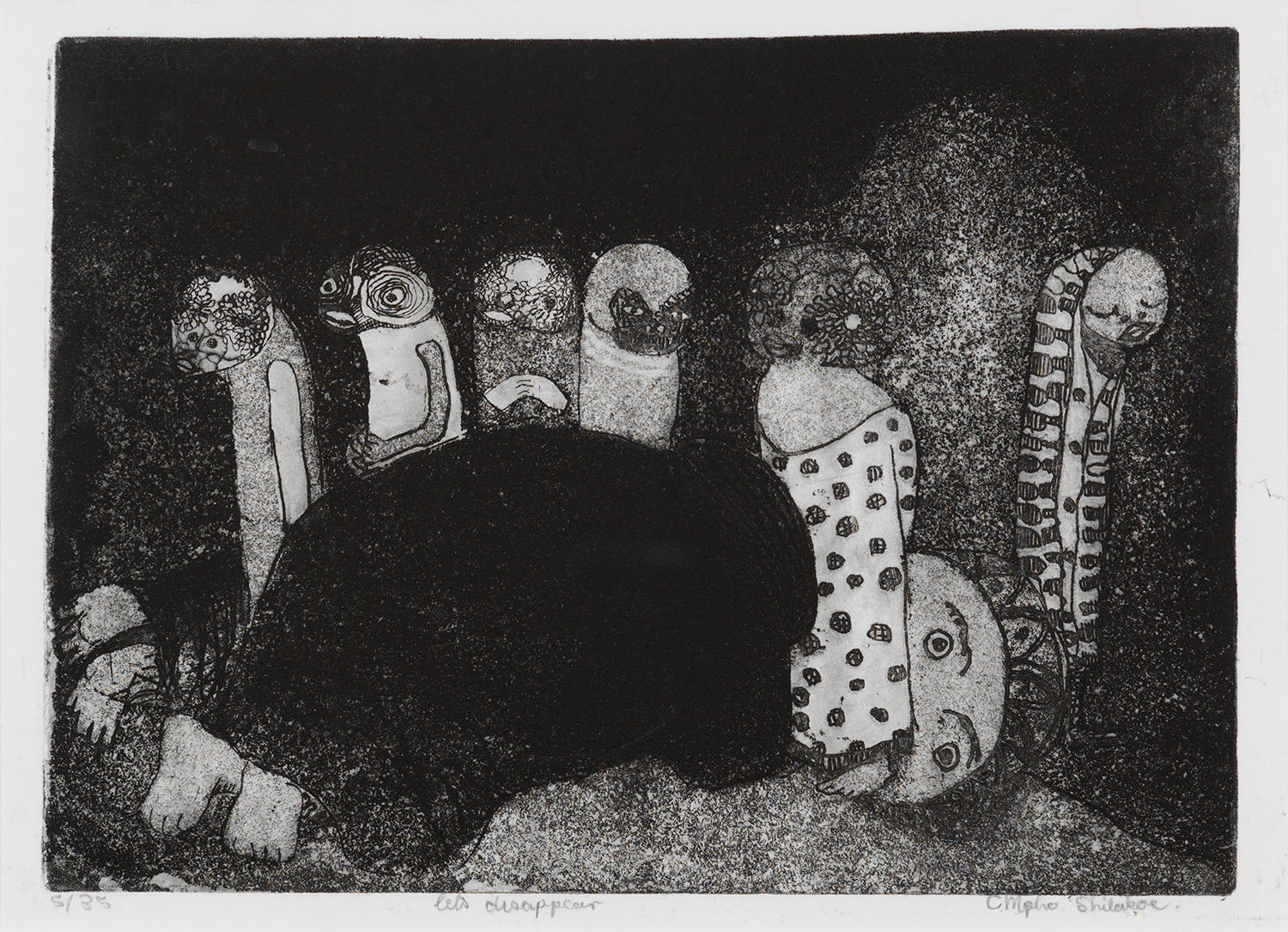 According Rakgoathe, Shilakoe’s inspiration came from clouds moving across the sky, wind in the trees, stains, splashes of paint. In these shapes he could see forms that suggested loneliness, poverty, broken promises and grief. Shilakoe worked mainly in black and white, using different kinds of printing. He explored the techniques of etching, using soft, painterly, blurred aquatints. He seems to allow his images to grow out of the darkness.