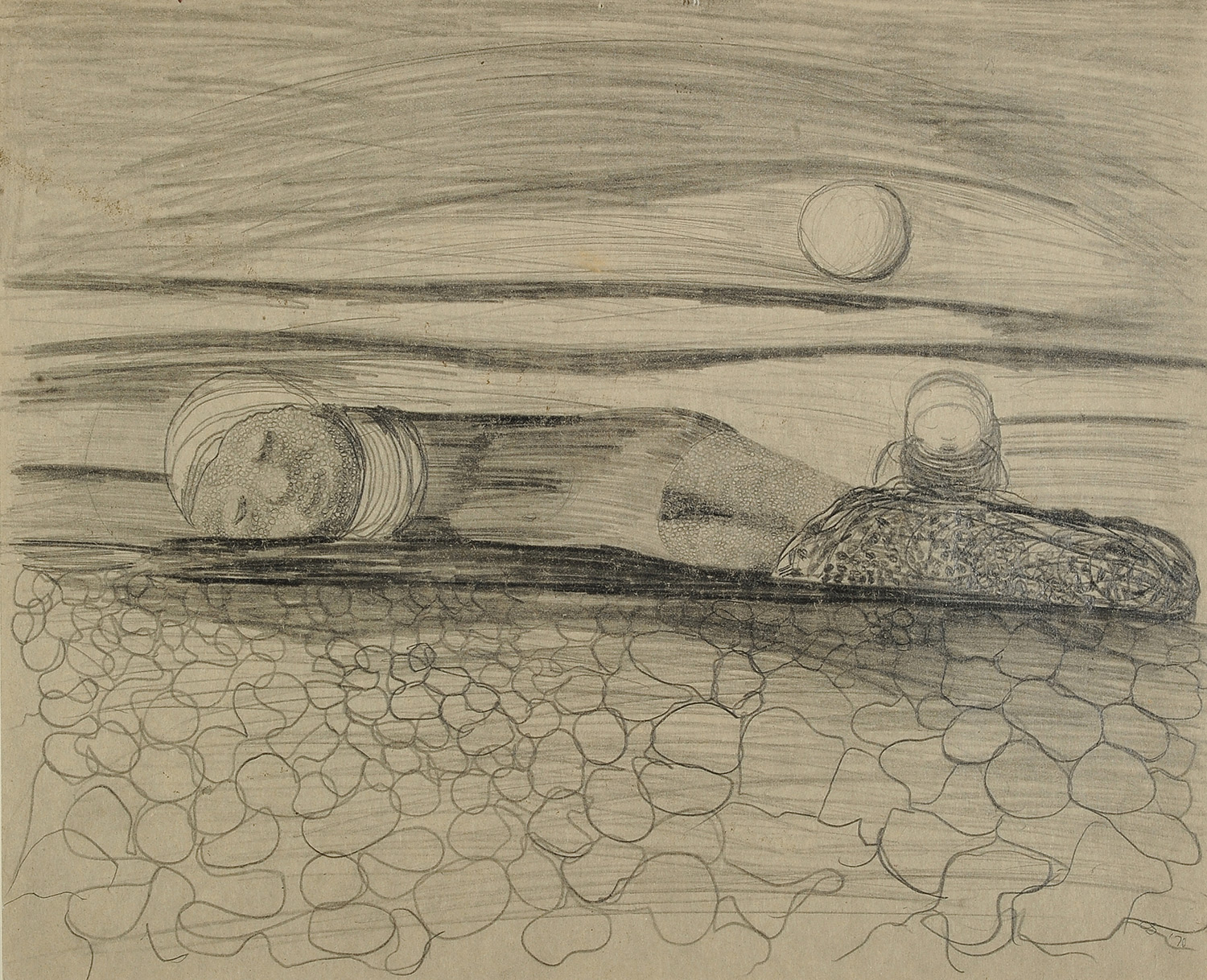 This work features two figures joined together in sorrow, the most distinct markings drawing attention to the lines in their faces and the tracks of their tears. The mournful atmosphere and misty, ghostly atmosphere is typical of… Continue Reading