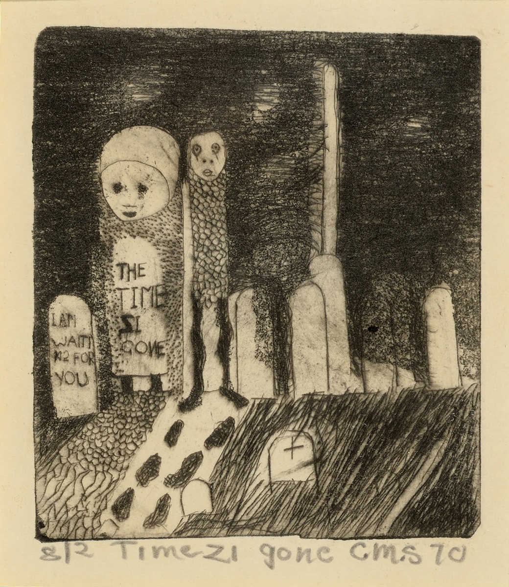 He died in a car accident in 1972 just as he was about to be awarded first prize in printmaking at an exhibition at UCLA (University of California Los Angeles). In his tragically short artistic career, his output was enormous – he produced about 80 prints and a number of wooden sculptures within the space of about three years.