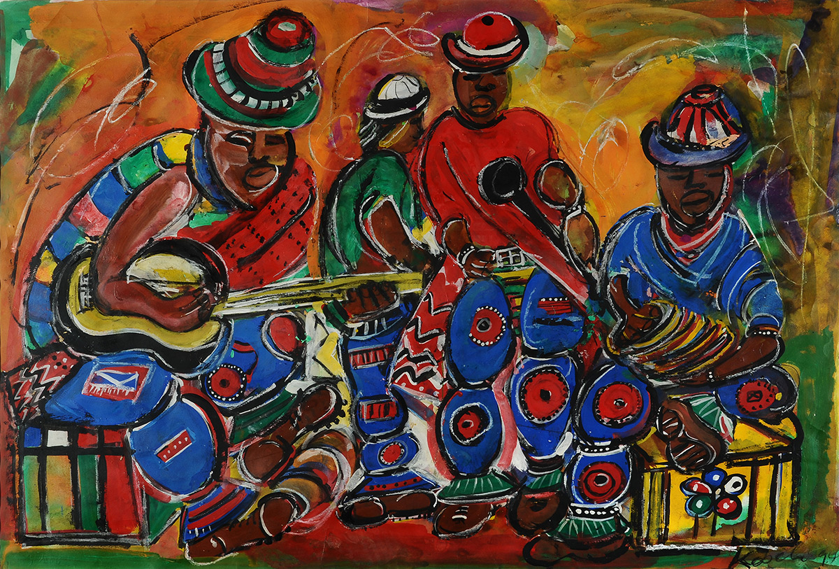 Kobeli’s work is often described as vibrant and abstract, earning him the nickname the ‘Chagall of Soweto’ for his playful spirit and imaginative compositions. His paintings reflect urban life, particularly in Soweto, and he exhibited extensively both in South Africa and internationally before his passing in 1999.
