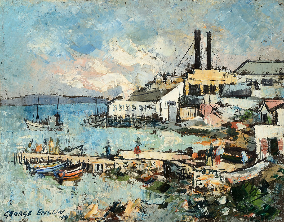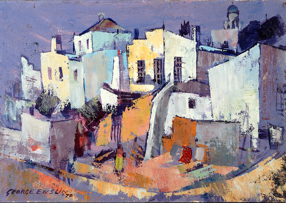 George Enslin was educated at Higher Boys School in Wellington and Higher Boys School in Stellenbosch. He studied commercial art under Arthur Podolini-Volkmann at the School of Commercial and Fine Art in Cape Town in 1941 and under Maurice van Essche at the Continental School of Art in 1946. He then went on to study at Heatherley School of Fine Art in London in 1949, at Académie de la Grande Chaumière, Paris in 1950 and sculpture at the Academy of Fine Arts, Carrara, Italy, also in 1950. He returned to South Africa later the same year.