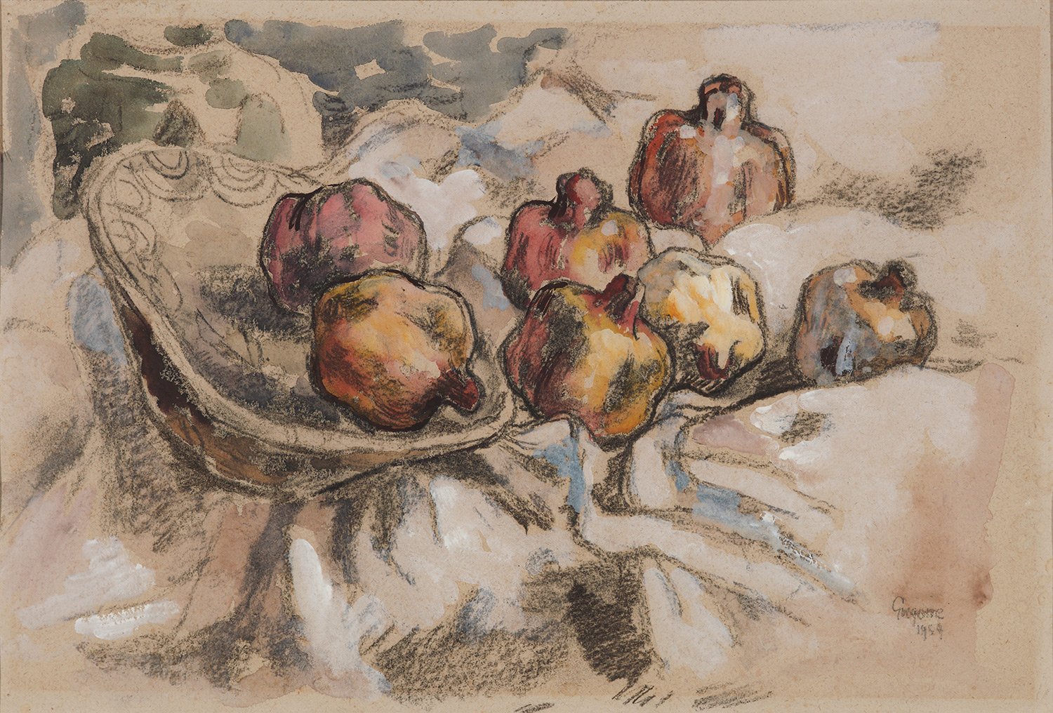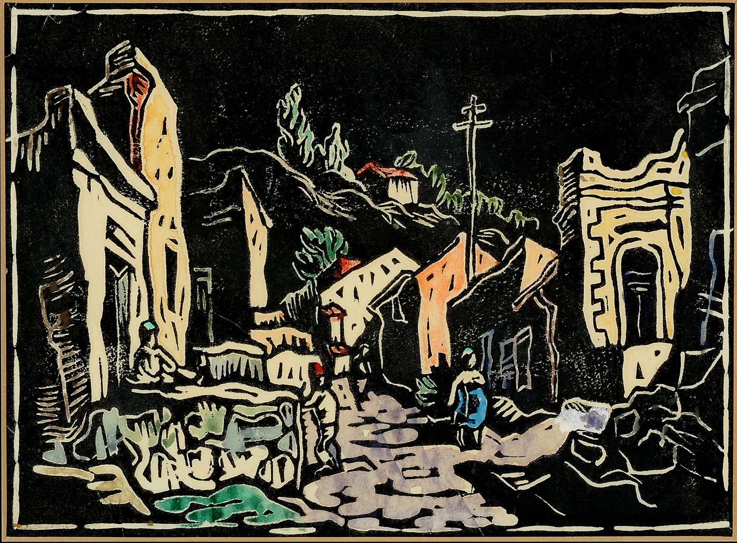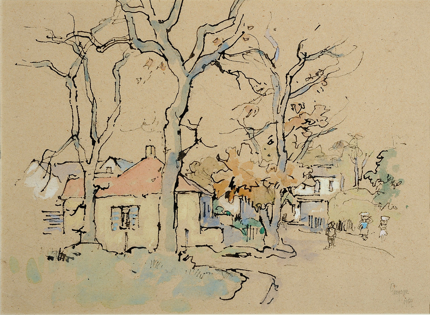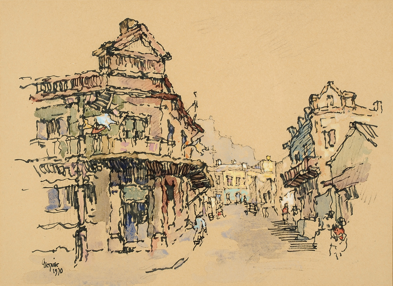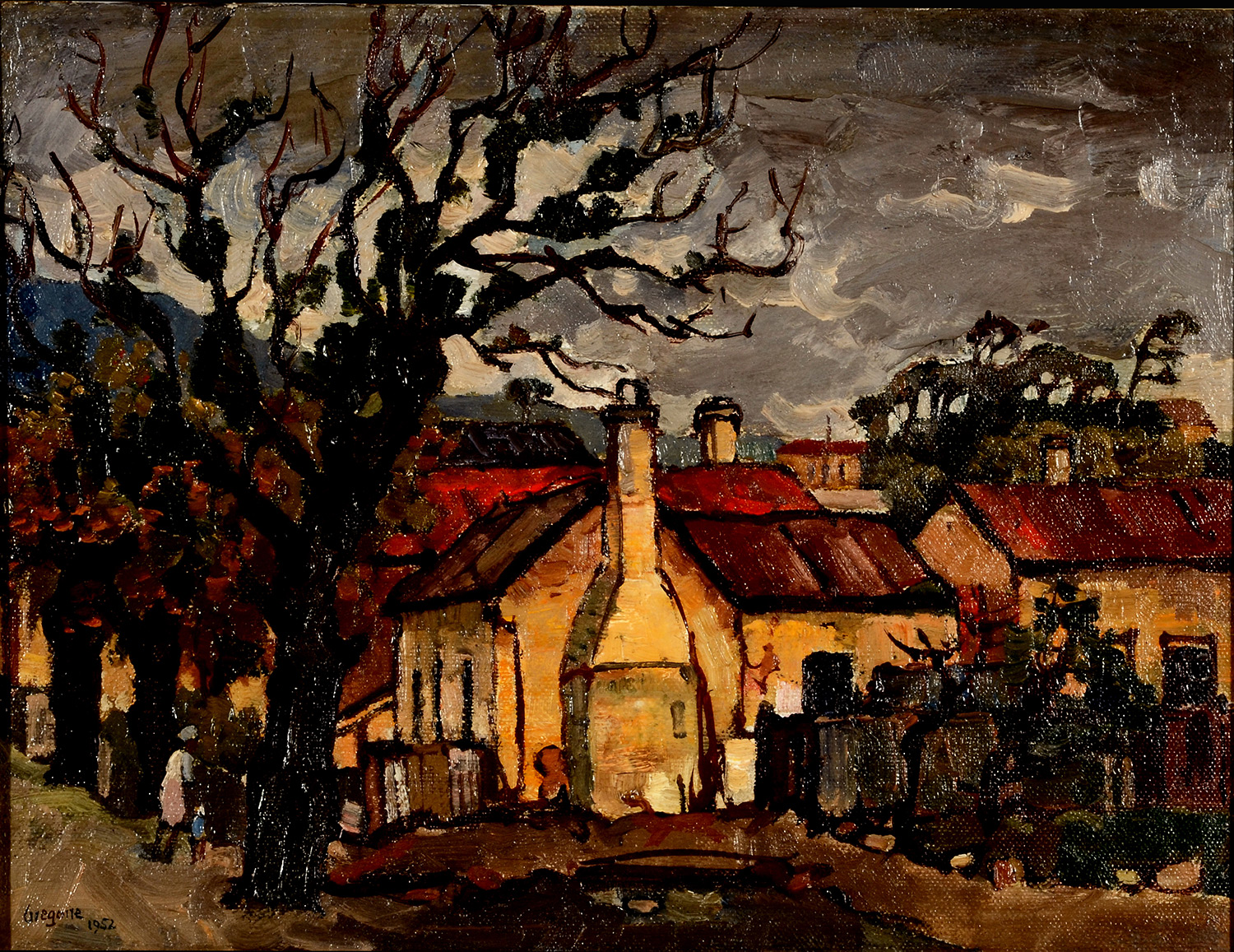 In 1935, he left for London to study at Heatherley’s School of Art with fellow artists Terence McCaw and Frieda Lock. There, he was exposed to the European influences of Van Gogh, Cezanne, Utrillo, Braque and Christopher Wood. He travelled to several European countries, including France and Russia, and painted in Spain with Terence McCaw. In 1937, he enrolled in a one-year course with the Central School of Arts and Crafts, concentrating on graphic art techniques.