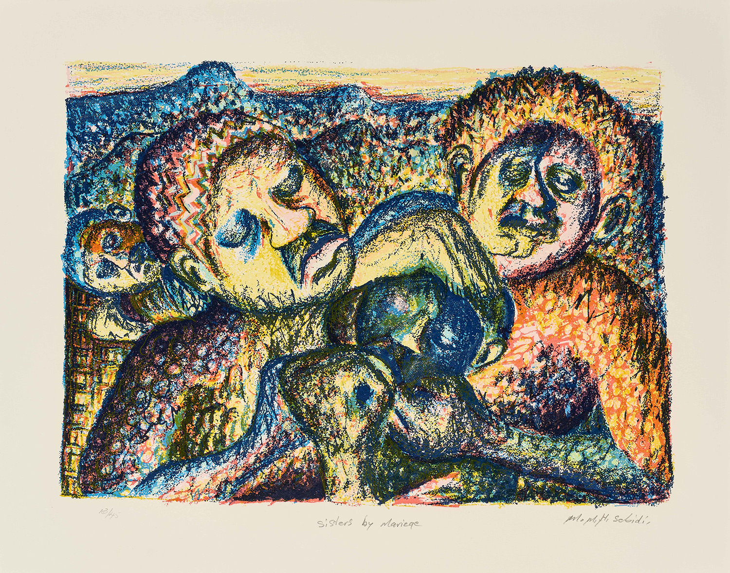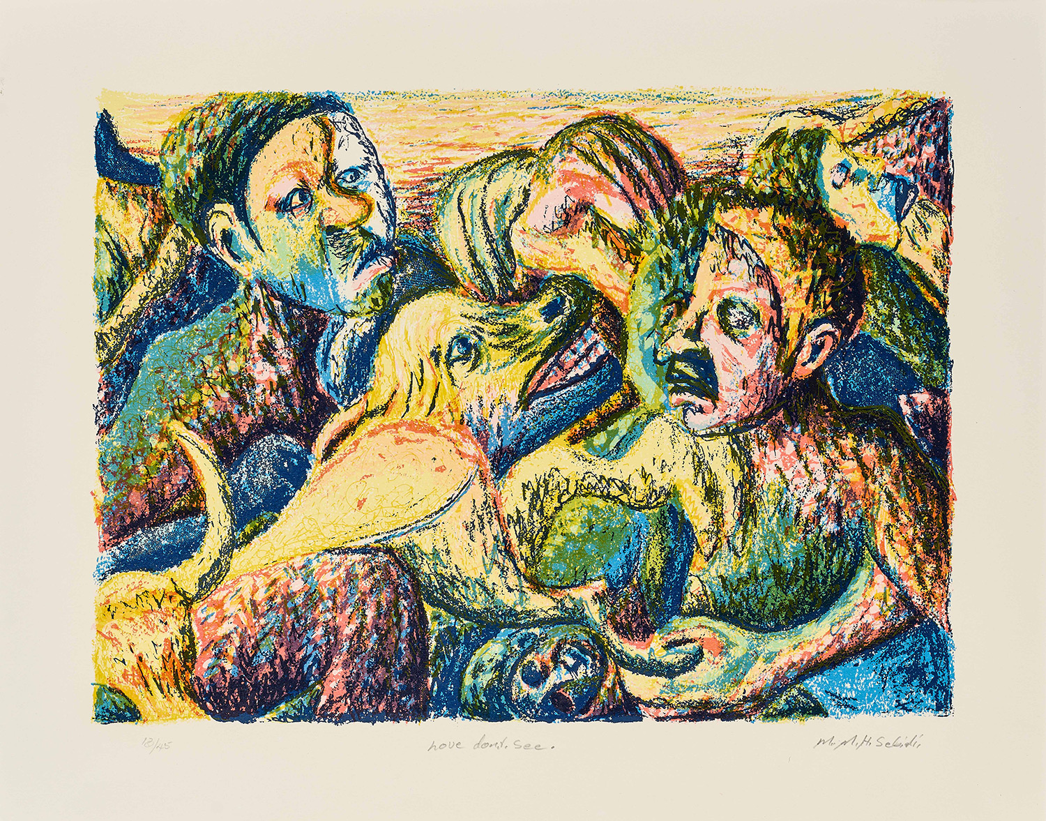 Batlhaping Ba Re!, a solo exhibition of works by Sebidi from a career spanning five decades, curated by Portia Malatjie, ran at Norval Foundation in Cape Town from 2018 – 2019. Her work also featured as part of When Rain Clouds Gather: Black South African Women Artists, 1940 – 2000 at Norval Foundation (2022 – 2023). Curated by Malatjie and Nontobeko Ntombela, this group exhibition was a reflection upon the influential and often unacknowledged contributions of Black women to South African art history in the twentieth century.