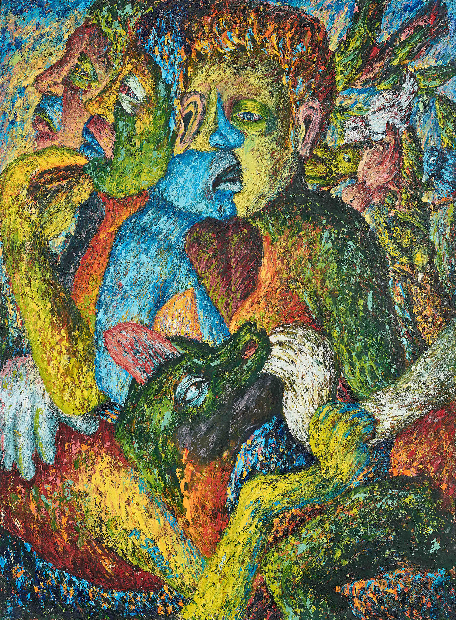 Celebration After Initiation is a figurative work, which show human bodies entwined with one another and with the bodies of non-human animals or entities. A feeling of collectivity, physicality, and togetherness prevails, with faces and limbs merging with one another in spirited moments of unfettered comingling. An animistic mood pervades Celebration After Initiation, with a tangle of birds and otherworldly creatures inhabiting the darkened space behind the three dancing figures.