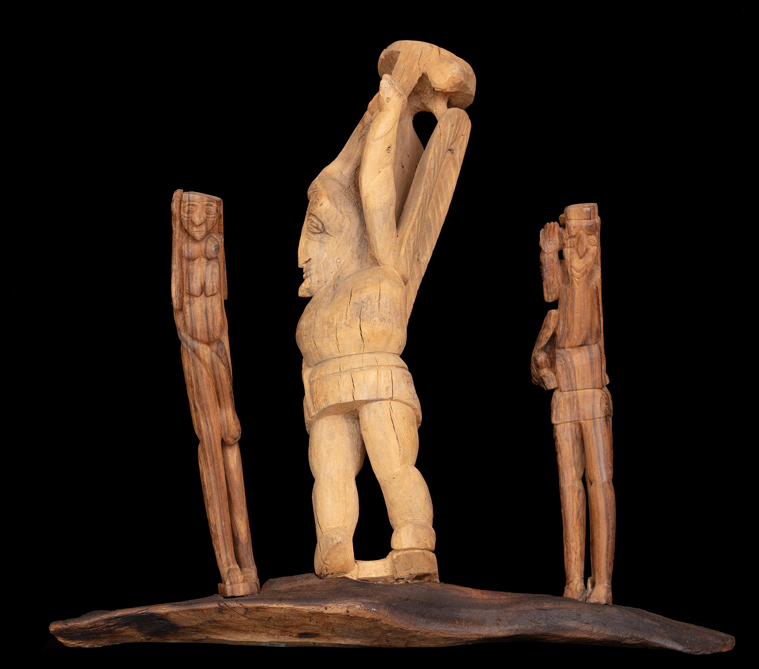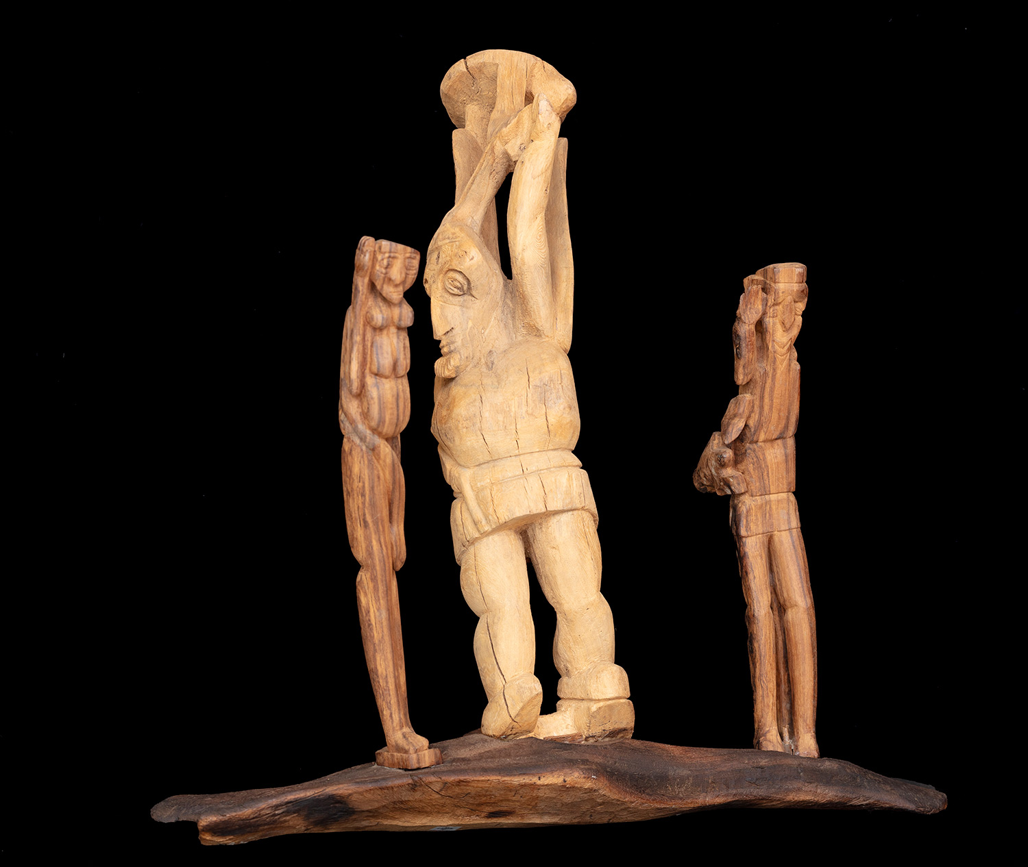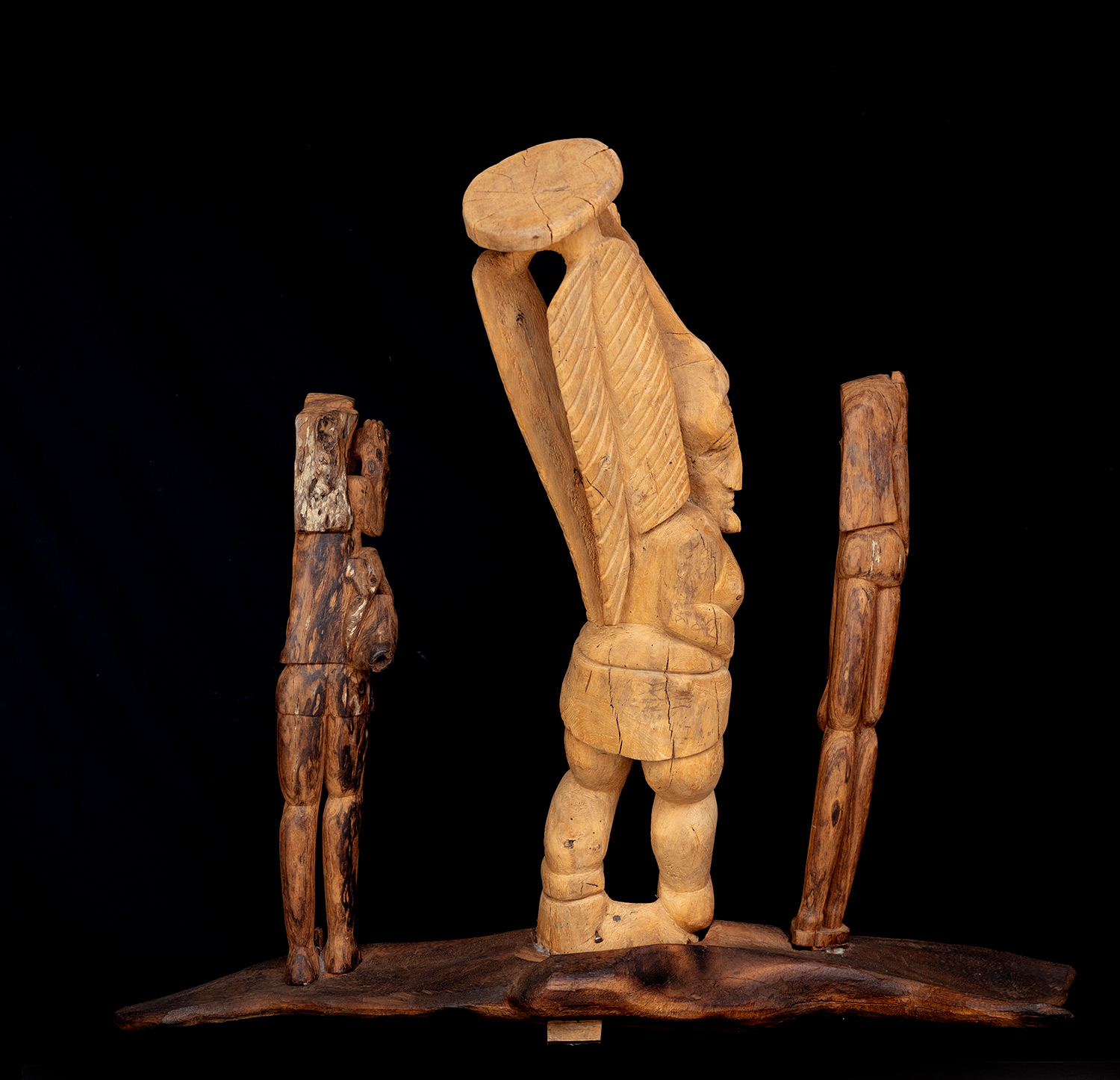 Hlungwani, like other leaders of the over 6 000 African Independent churches in South Africa, was both a charismatic spiritual leader and a healer. In his hill-top sanctuary, he built two altars, one for women and one for men, which he embellished with figurative sculptures; he narrated their roles during his religious services and healing procedures. Both altars were removed for display in his retrospective exhibition in Johannesburg in 1988 and were subsequently purchased by local art institutions. All that remains of New Jerusalem are the ruins, the stone altars and the Aerial to God – a decorated telephone pole literally reaching to the sky.