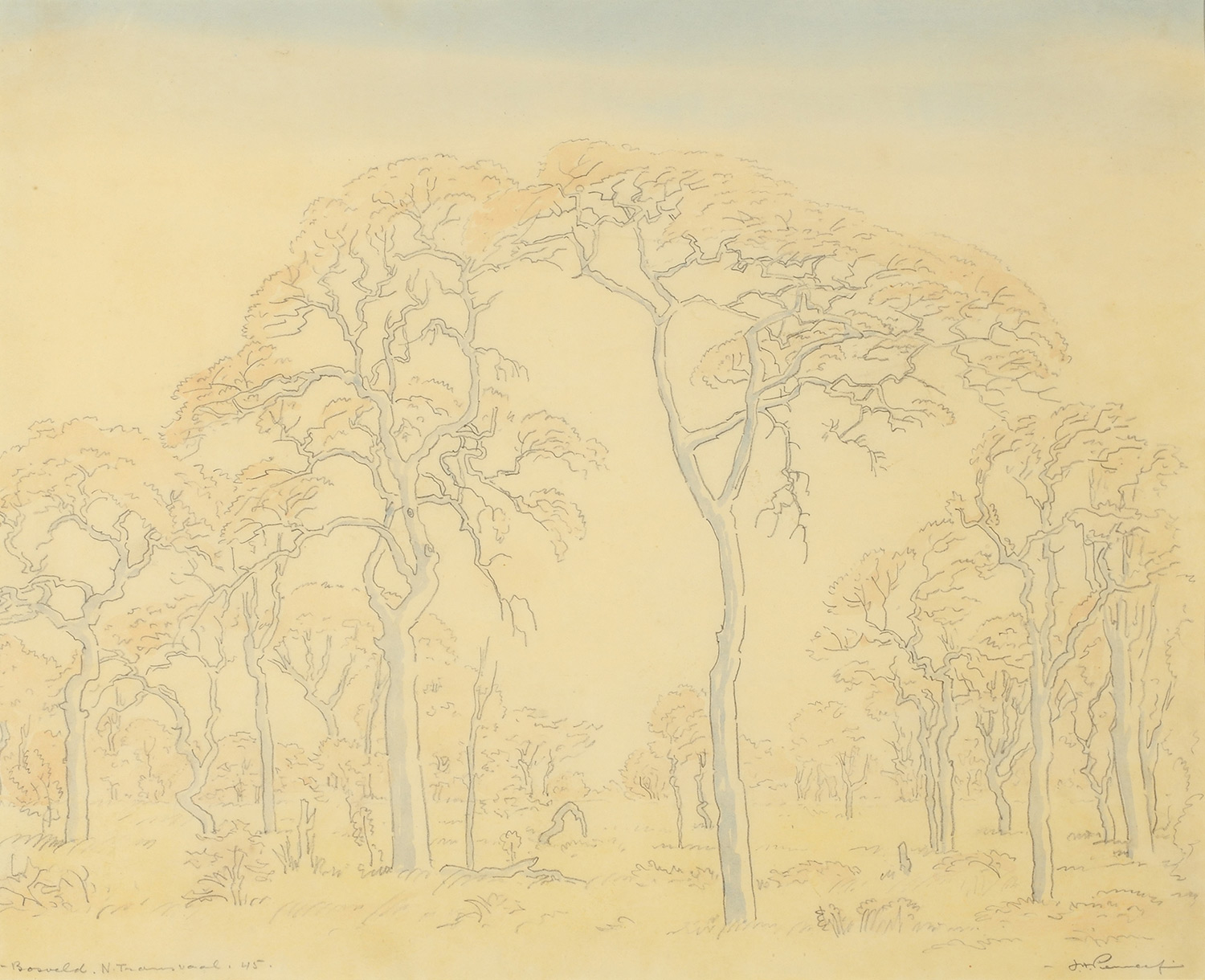In a long and prolific career, Pierneef worked almost entirely in the field of landscape art, depicting either an uninhabited landscape or one where trees and landmasses part to reveal glimpses of architecture. The human figure is absent from his art.
