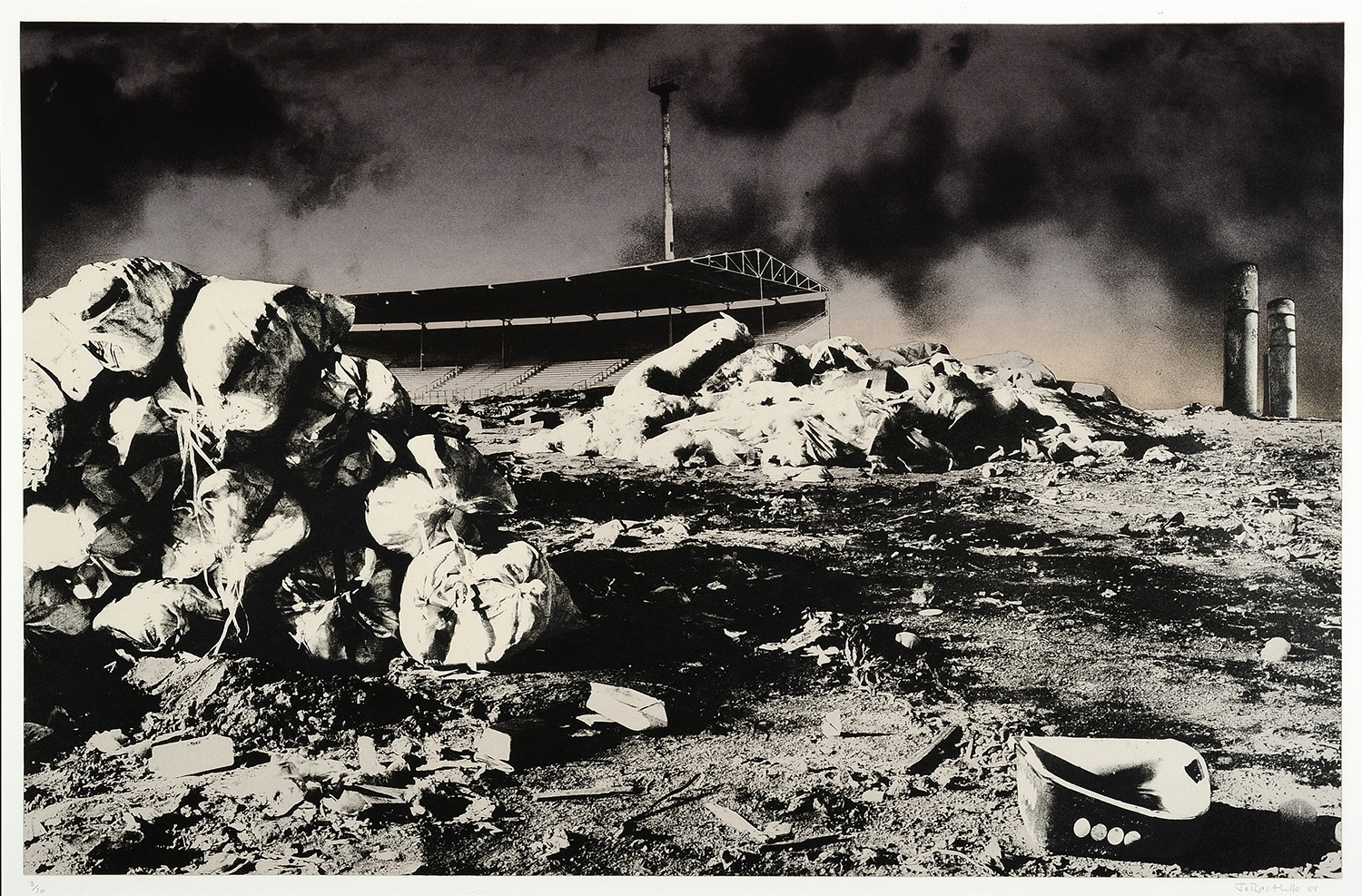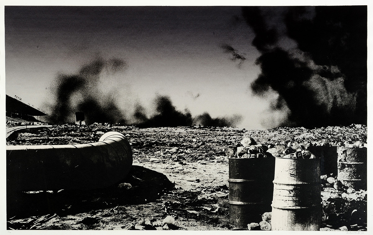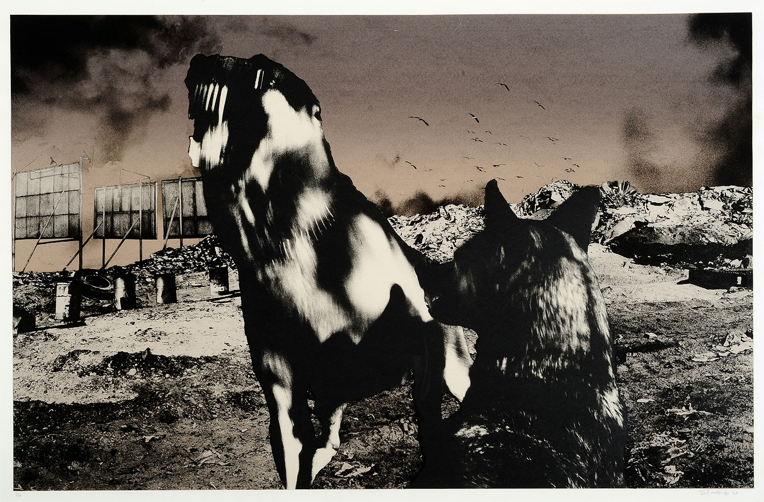 This photographic lithograph from Ractliffe’s dystopian Nadir series features a feral dog roaming about an urban wasteland of discarded trash. Dogs (dead, alive, wild, abandoned) are a perennial theme that runs through Ractliffe’s photographic oeuvre.