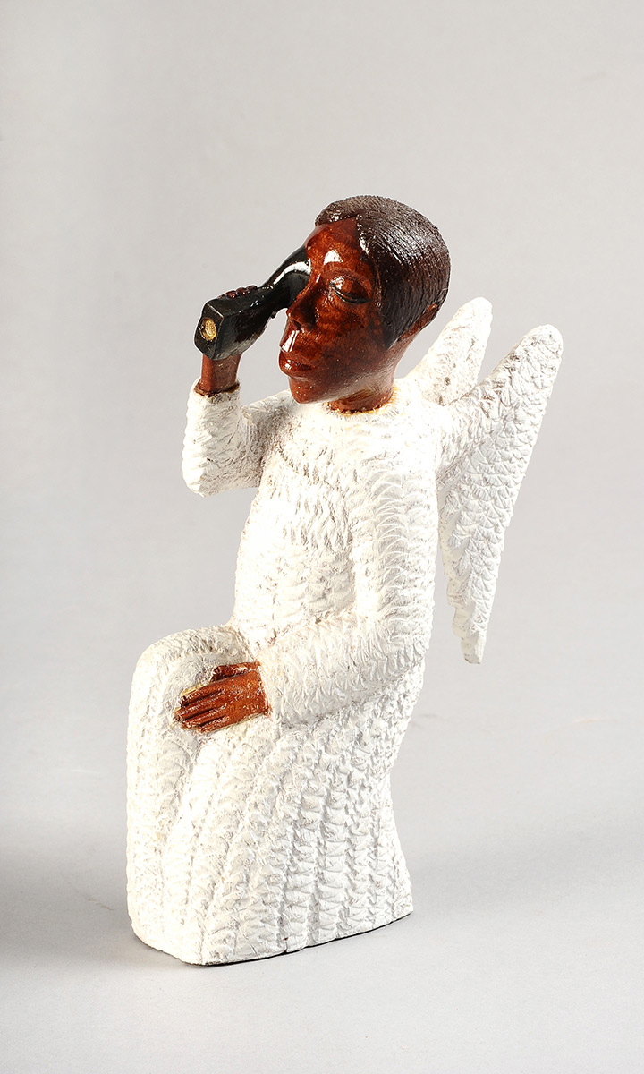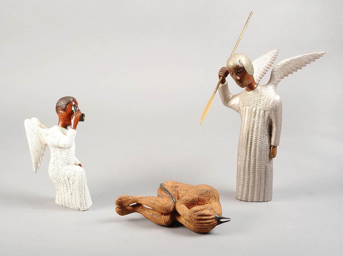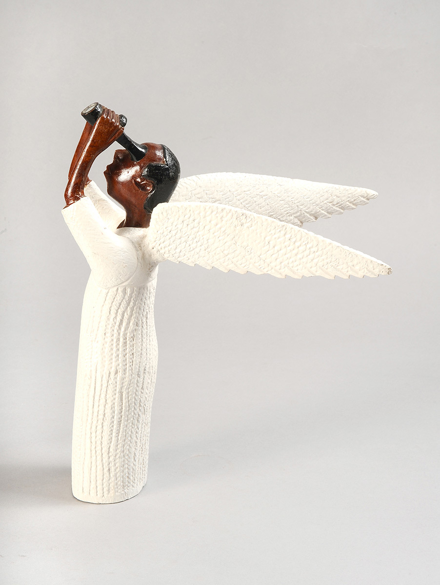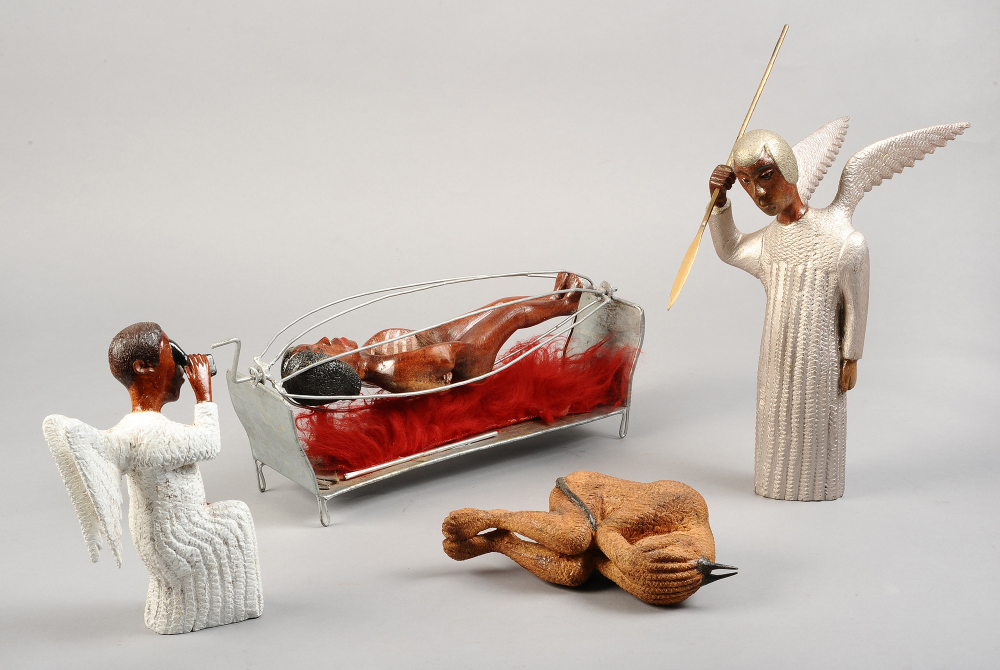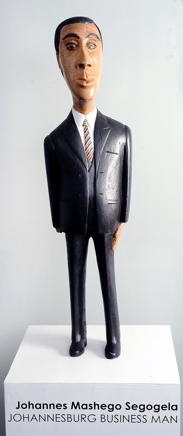 His painted wooden sculptures were inspired by the Bible and developed further through his own visions. Deeply concerned with the future of humankind, Segogela’s commitment to the anti-apartheid movement and his membership, from 1954 onwards, in the Church of Five Missions, influenced his work considerably. His goal, ‘to save the world from violence and horror’, started in the late 1980s with the work ‘Satan Fresh Meat Market’, with its figures of angels and demons.