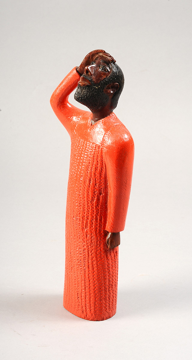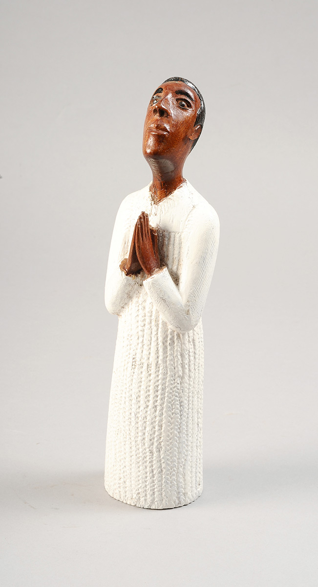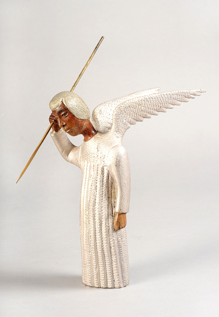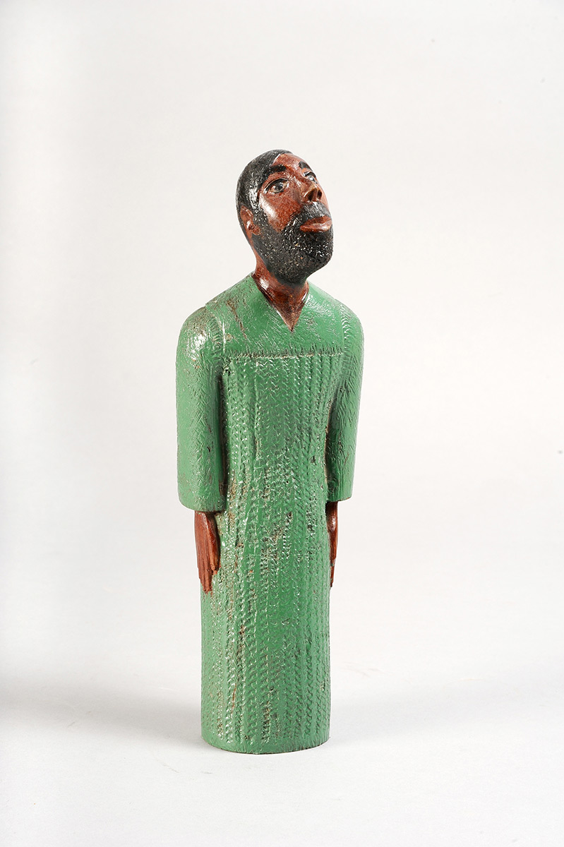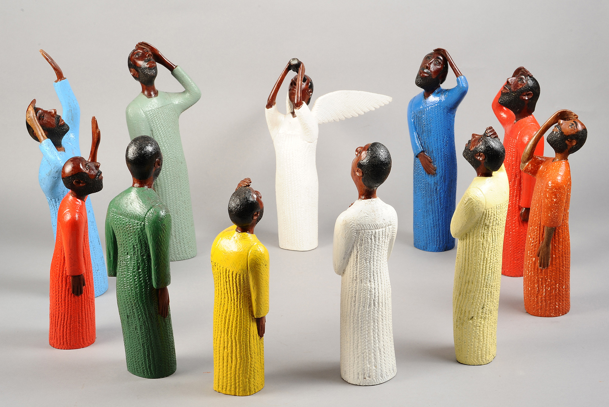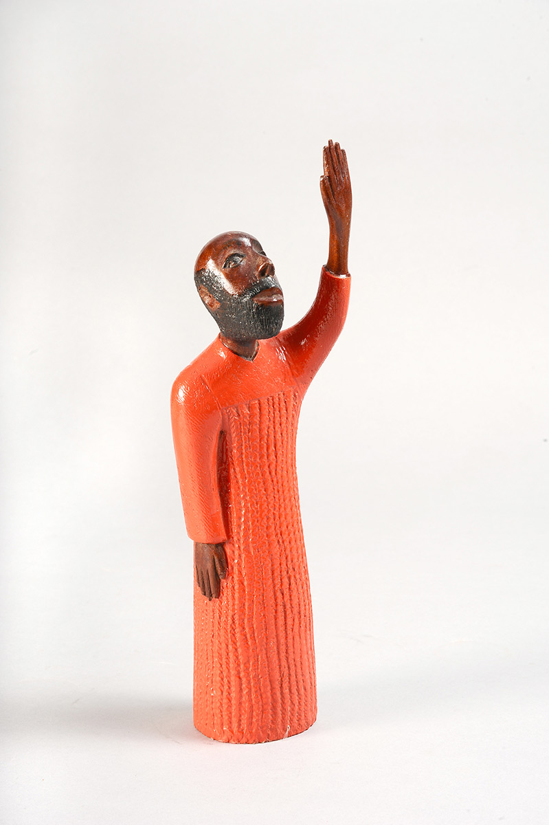His painted wooden sculptures were inspired by the Bible and developed further through his own visions. Deeply concerned with the future of humankind, Segogela’s commitment to the anti-apartheid movement and his membership, from 1954 onwards, in the Church of Five Missions, influenced his work considerably. His goal, ‘to save the world from violence and horror’, started in the late 1980s with the work ‘Satan Fresh Meat Market’, with its figures of angels and demons.