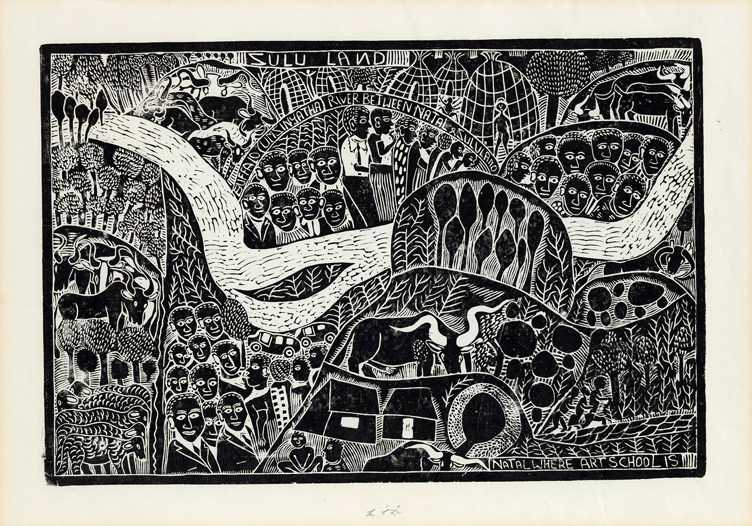 The Rorke’s Drift Art and Craft Centre was founded in 1962 by the Swedish couple Ulla and Peder Gowenius and played a significant role in the development of South African art in the second half of the 20th century. Here Muafangejo came into contact with different artistic techniques, such as weaving, woodcarving, painting and pottery. One of his teachers was Azaria Mbatha. He distinguished himself particularly in etching and linocut.