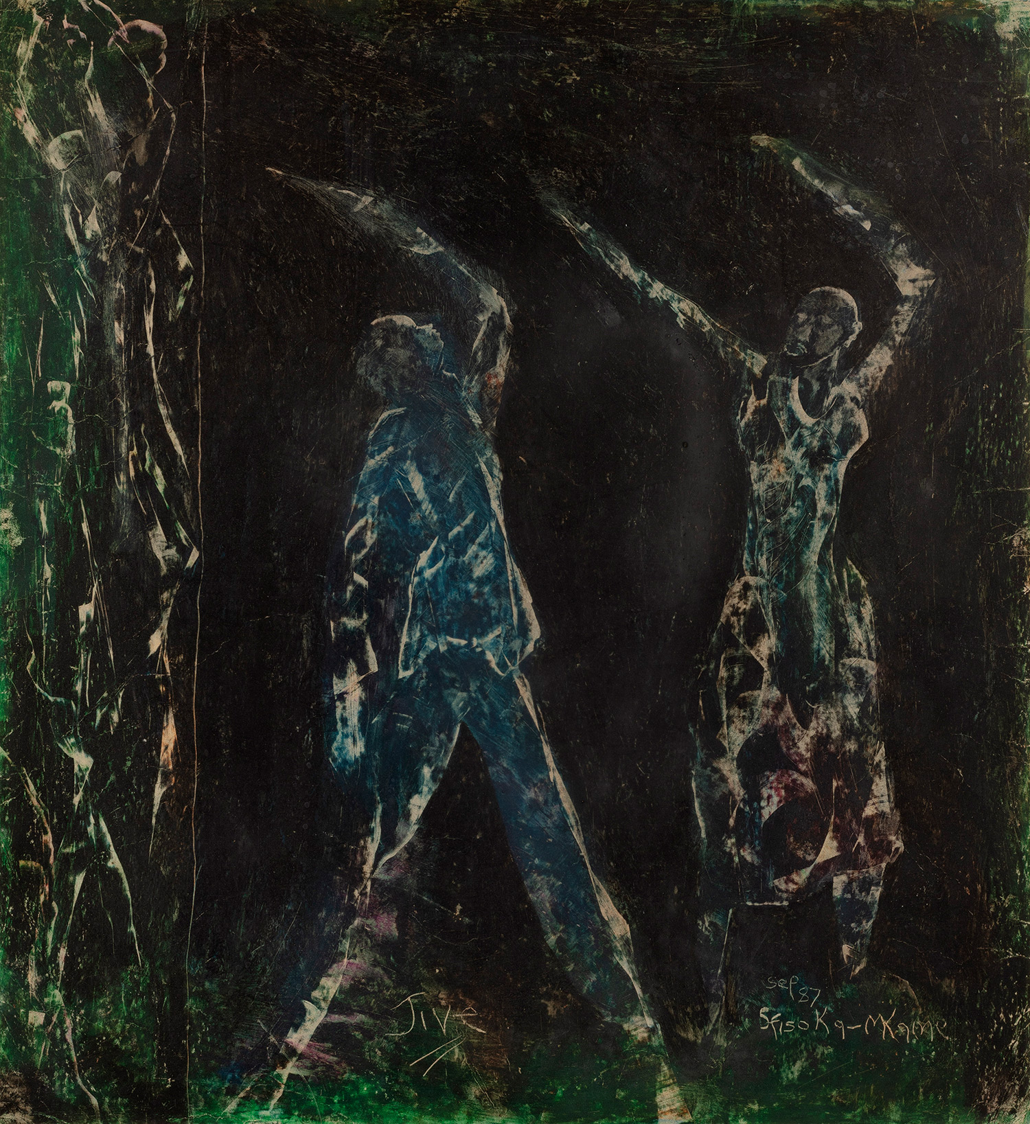 Justice Sfiso Ka-Mkame was born in in Clermont, Durban. Ka-Mkame is largely self-taught and began his artistic journey by drawing on sand walls as a child. He later received formal art training at the Open School in Durban in 1982 and at the Little E Theatre in 1983.