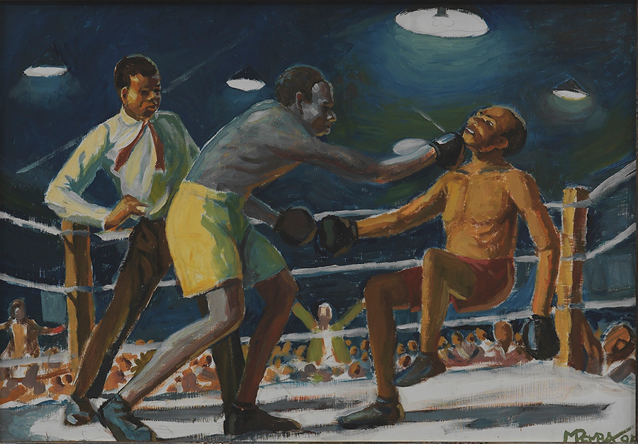 The works loaned from the SABC Art Collection were: George Pemba’s Boxers in the Ring (1995); Cyprian Mpho Shilakoe’s Stop Crying Mother, He May Come (1969); David Koloane’s Smoky Cityscape II (2008); Guy Tillim’s Mai Mai militia in training near Beni, eastern DRC for immediate deployment with the APC (Armee Populaire du Congo) the army of the RCD-KIS-ML, Portrait VI (2003); three archival photographs from Santu Mofokeng’s Black Photo Album/Look at Me: 1890–1950 (1998) [originally produced as a slide projection for the Johannesburg Biennale in 1997] and David Goldblatt’s Cells (1999).