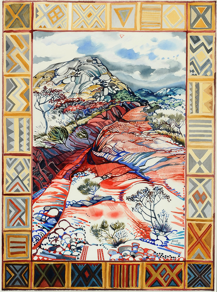 Within her practice, Arnold works in a variety of media, including oil paint, watercolour, pastel and print. Her work features simplified forms, an expressive use of bright, playful colours and distinct patterning. Her landscapes reflect her interest in and concern for the natural environment, a major source of inspiration being the Matopo Hills, which lie within the Motobo National Park, Zimbabwe. The Park’s famous balancing rock formations are a recurring motif throughout Arnold’s oeuvre.