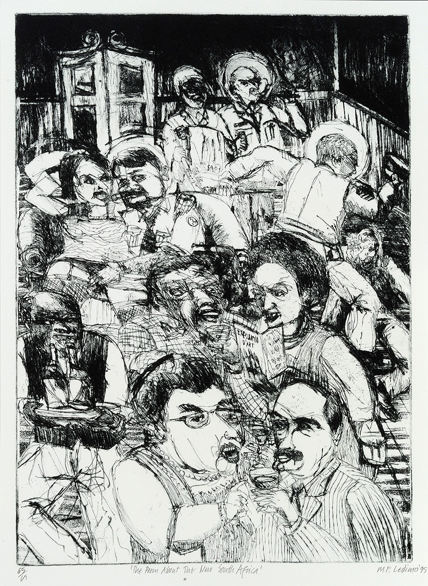 Moleleki Frank Ledimo’s work explores themes that reflect the socio-political landscape of South Africa. His art often employs printmaking techniques, using mediums like lithography, to create detailed and layered compositions that explore the complexities of South African identity, history and culture.