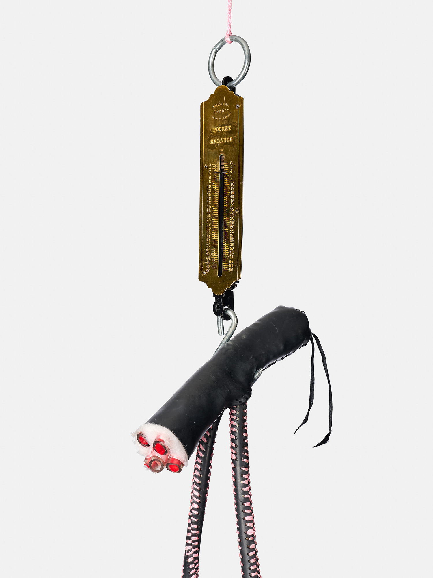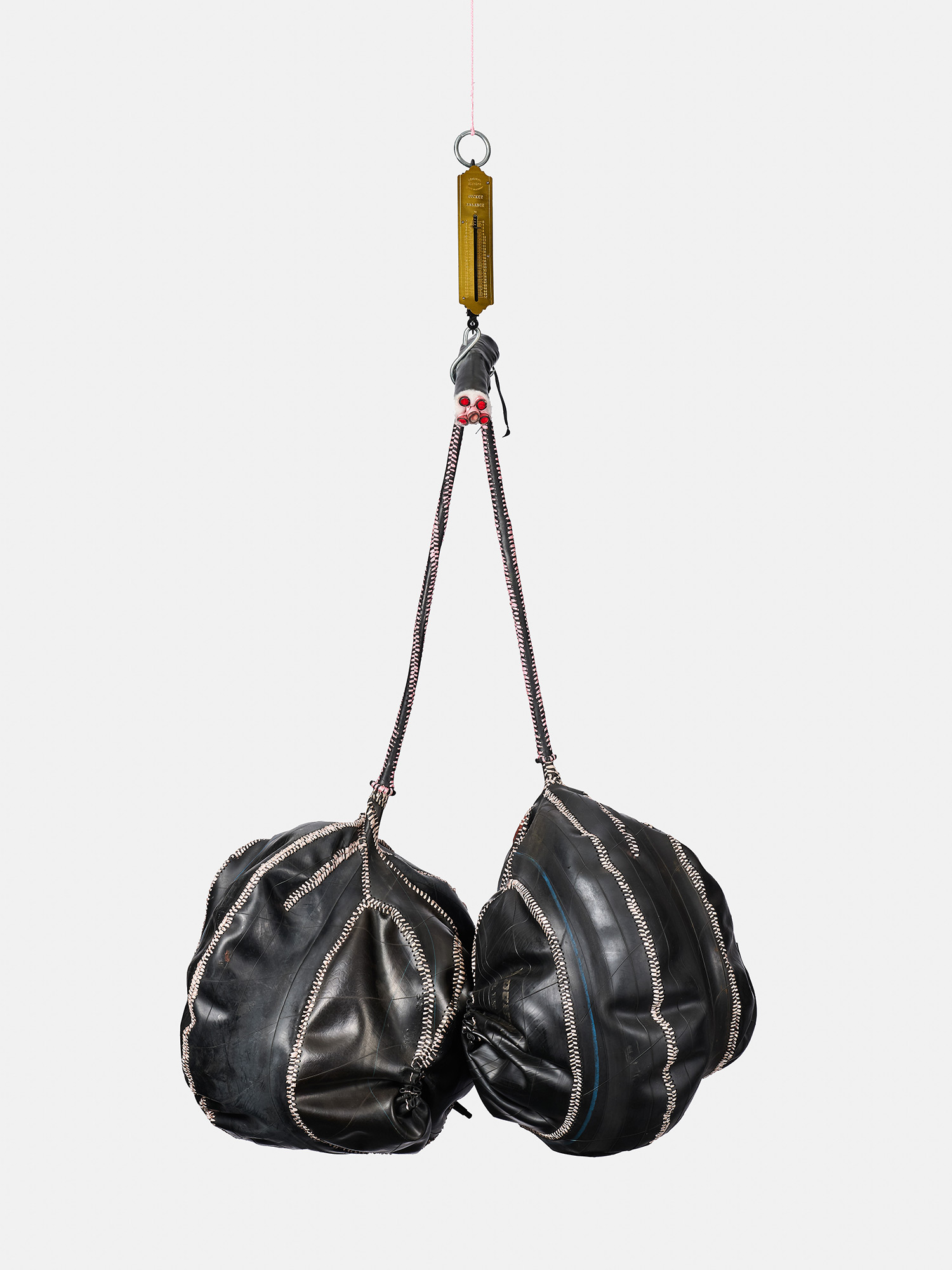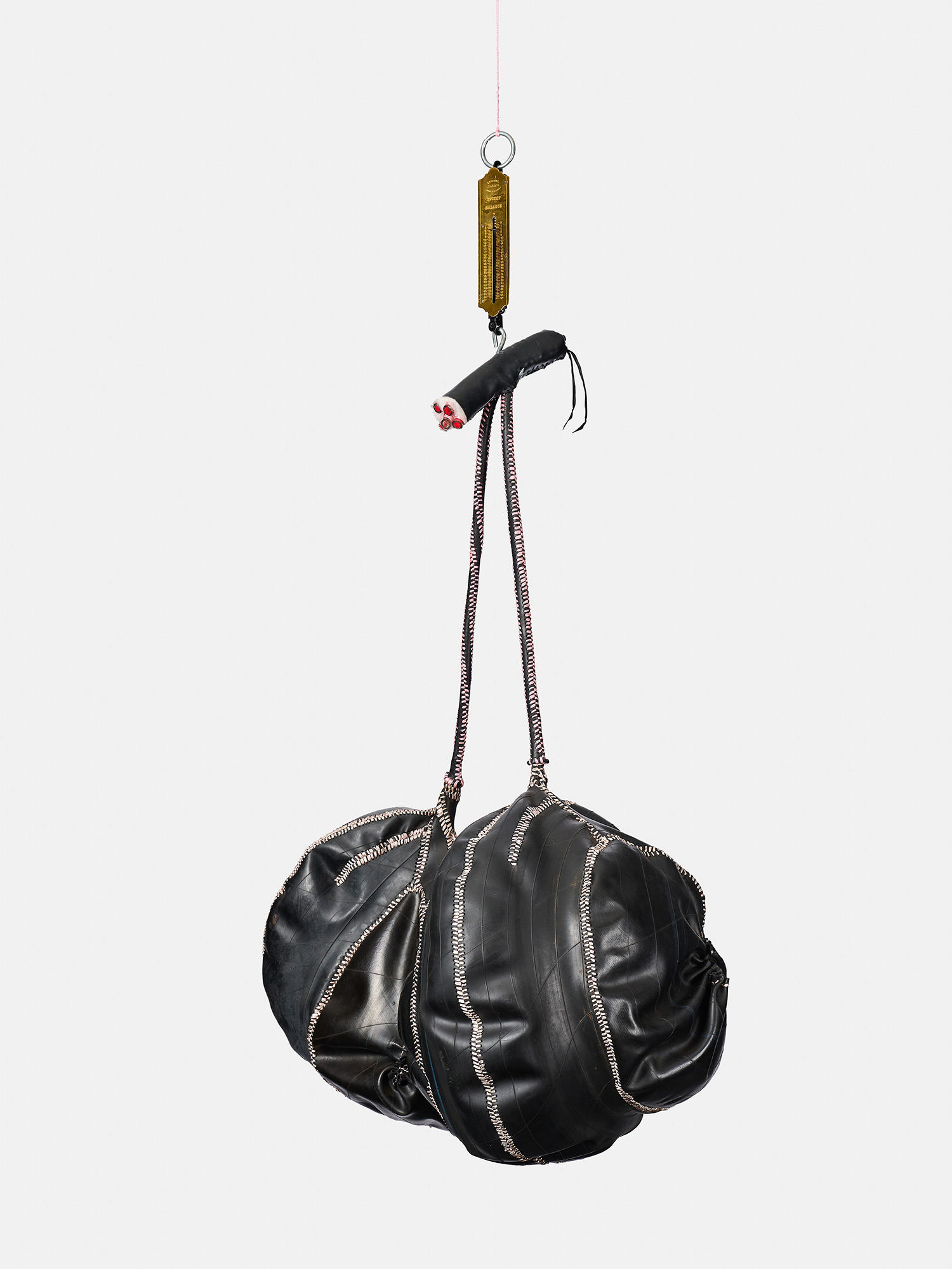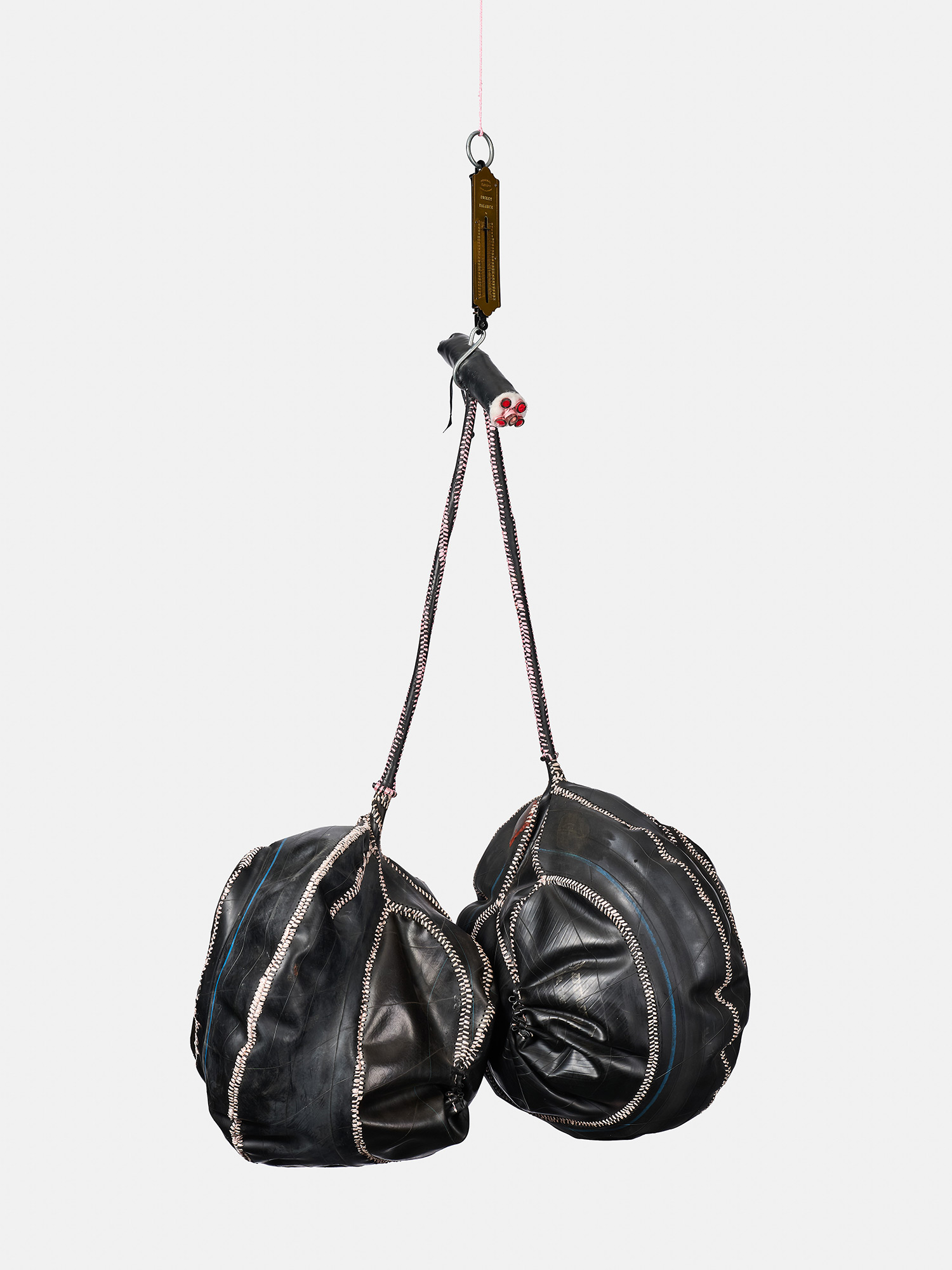 I’ve made these two balls and an amputated phallus-like shape. It could be a dildo, or the gear stick of a car, if you look at the stitching. The rubber that covers it looks like a sheath. And it’s suspended on a scale. I was thinking about someone going to an old general dealer in the countryside or the township, where you get anything from needles to food – you get your shoes there, your jacket … You’d get some beans or grain and you’d weigh it using the scale. Even fishermen could use this scale. You would get the scale in a butchery. And these balls, the whole structure, looks to me like something that is butchered. The reason I thought of something being butchered is because of the problems we have around male circumcision in Xhosa culture. Some boys have to go to hospital because of botched circumcision. The penis part is cut. I used red ribbon there to suggest veins, blood that is flowing through. I went rough on it, like an inexperienced surgeon.