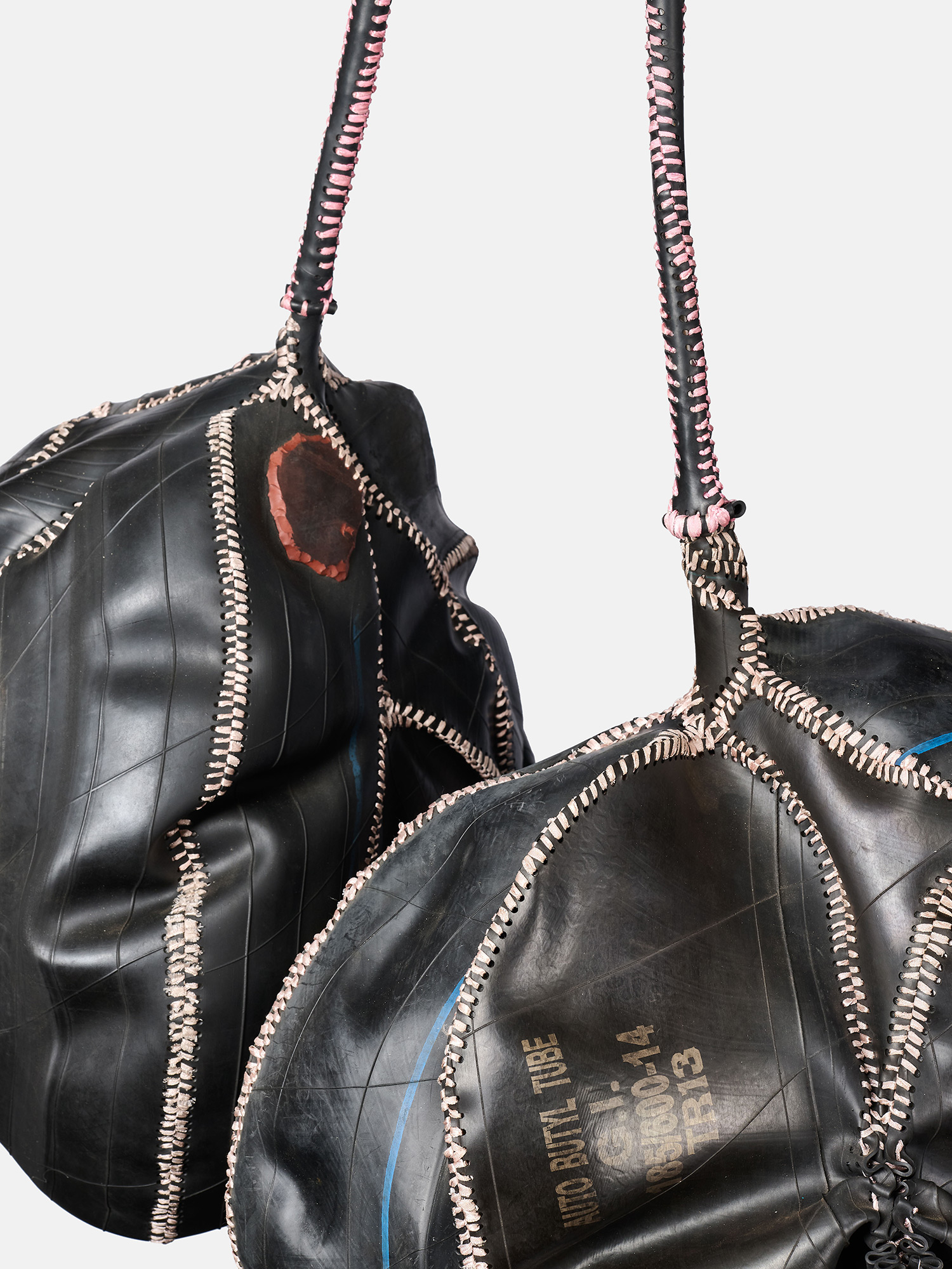 Using tactile materials such as ribbon, leather, wood and rubber detritus that he melds and weaves together, Hlobo creates intricate two- and three-dimensional hybrid objects. Each material holds a particular association with cultural, gendered, sexual or ethnic identity. His evocative, anthropomorphic imagery and metaphorically charged materials elucidate the artist’s own multifaceted identity within the context of his South African heritage.