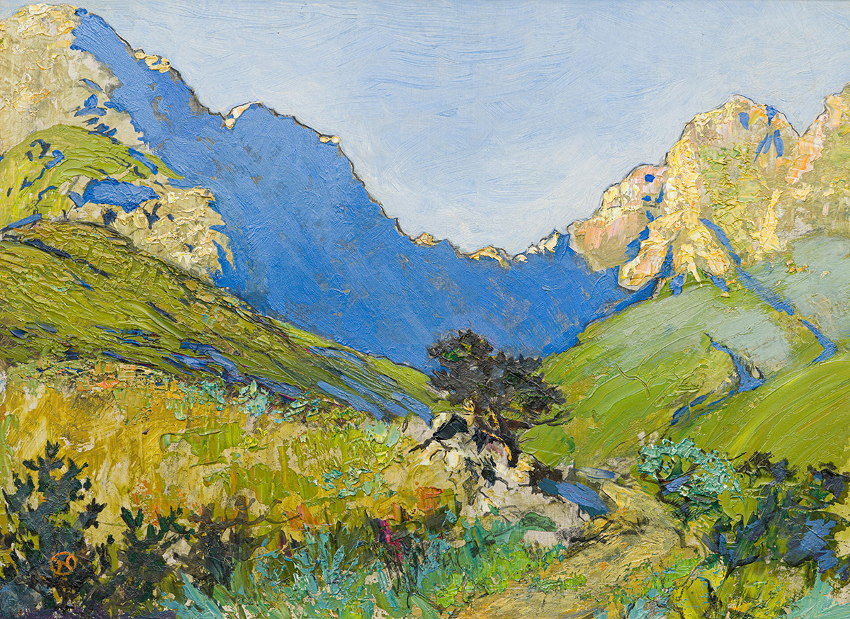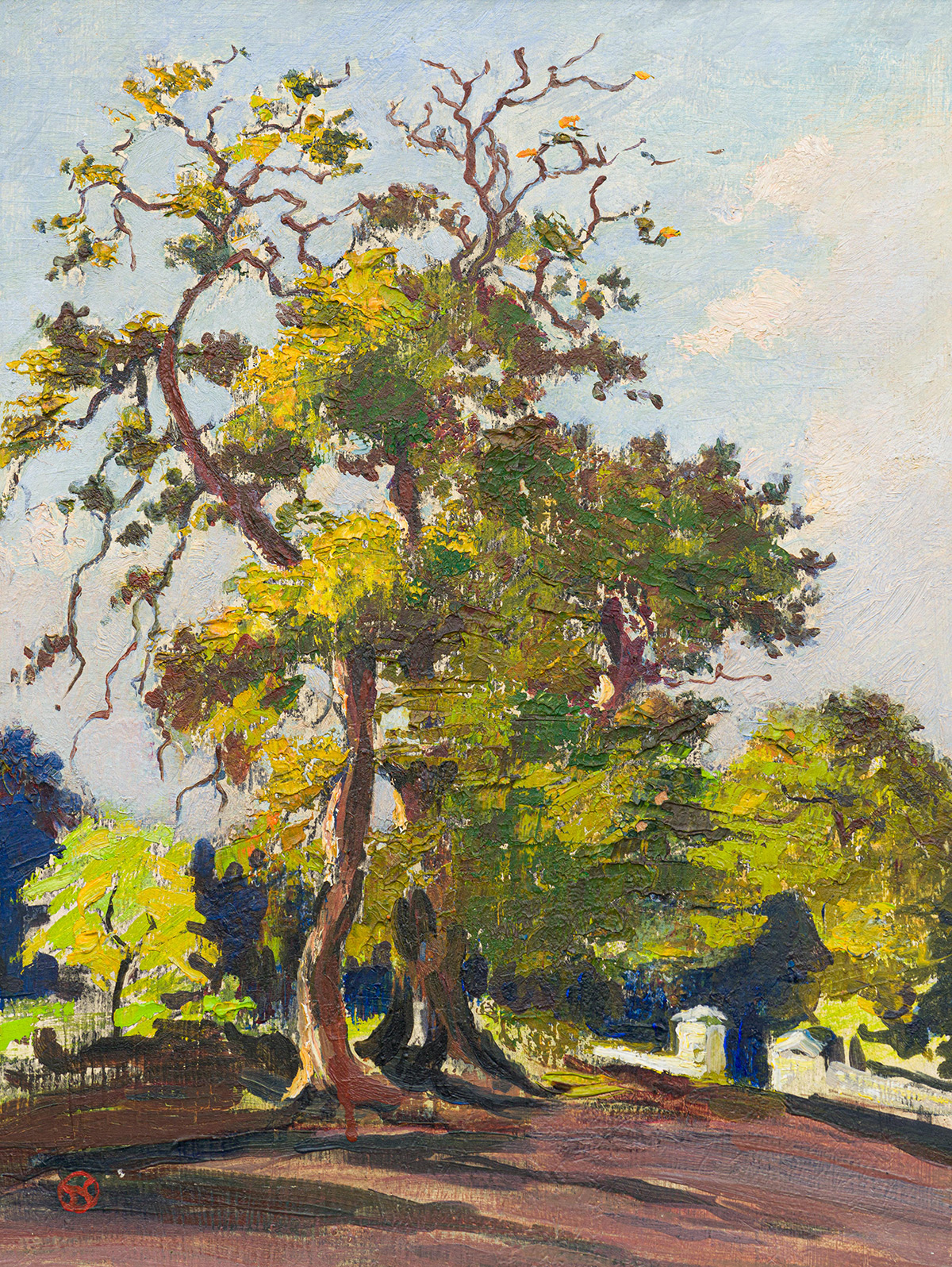 Working from a studio in Keerom Street, Spilhaus established herself as a leading member of Cape Town’s art community. Her most active artistic period was this time she spent in Cape Town as part of a close-knit group of artist friends, working and exhibiting together. She was principally an Impressionist landscape artist, best known for her atmospheric oil paintings and vivid etchings of trees, the Cape mountains, and the Malay Quarter. The Stone Pines around Cape Town are a recurring theme in her work.