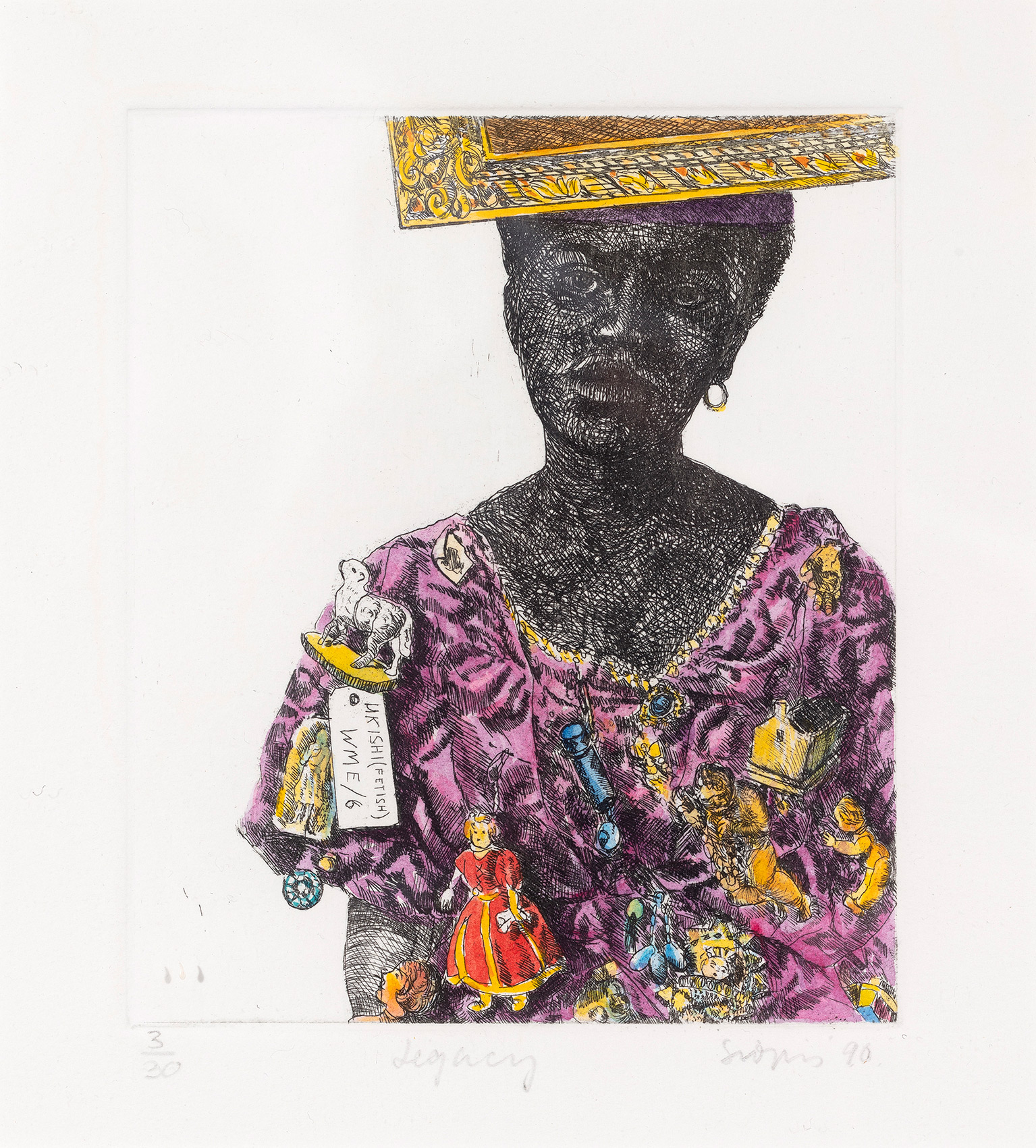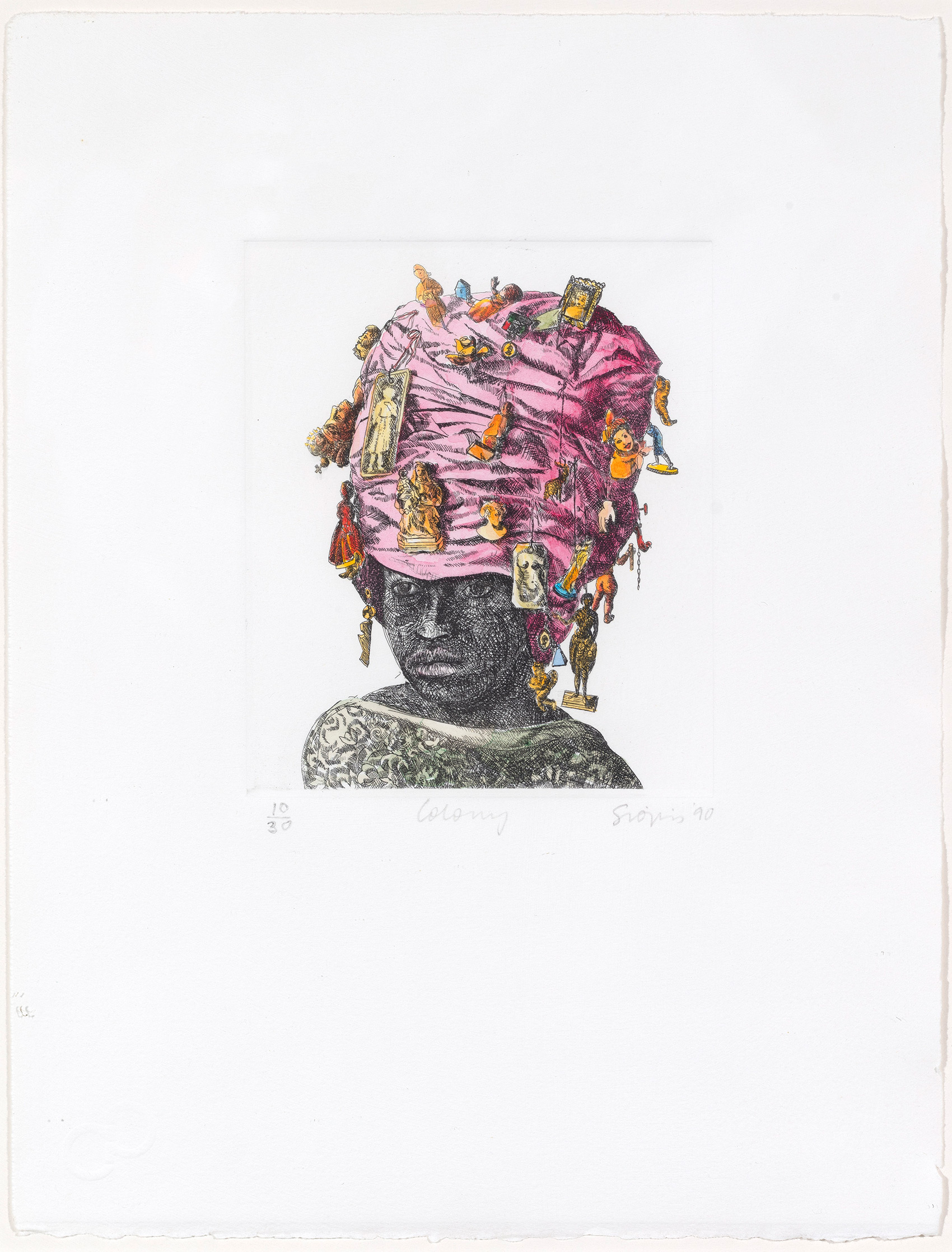 The vast stylistic differences in these works evidence Siopis’s daring experimental spirit as an artist – and her sustained commitment to exploring intense psychic states through varied media and materials, from oil and enamel painting and hand-coloured etching to found objects. She has also worked in sculpture, video and multimedia installation to explore intimate narratives that speak of personal and collective history, migration, trauma, shame and loss – in particular, memories of social and psychological trauma suffered by South Africans over time.