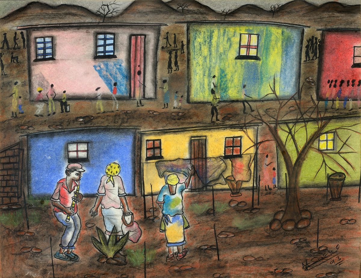 Peter Sibeko was born in Orlando East, Soweto, into a family with eight children. He was taught to draw and paint by his father, Walter Sibeko, and, by the age of 15, his artistic talent was already evident. He was mentored by David Mbele, who introduced him to charcoal drawing, and Solomon Sekhaolelo, who coached him in oil painting. Fellow artists Godfrey Ndoba and Ben Macala offered him ‘joint assessment’ and critique as they all struggled to make and sell their work in the dark days of ‘the struggle’ against apartheid.