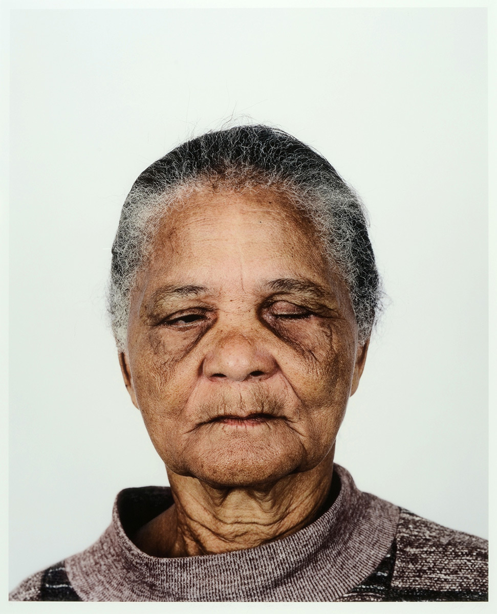 This portrait is part of Hugo’s Looking Aside series and draws attention to different kinds of blindness – actual blindness and willed blindness. In confronting the partial blindness of Maria Goliath – one eye obscured, the other squinting inwards – the reflex is to look away, but in so doing the viewer limits his/her/their own vision, momentarily blinding him/herself/themselves to the reality within the frame and, in effect, to the trials of the other.