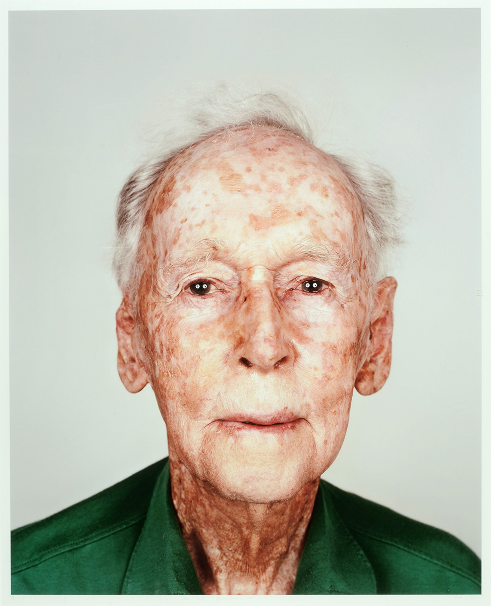 Along with the studio portrait of Maria Goliath, this frank and disarming portrait of Owen Knibbs is part of Hugo’s Looking Aside series. The photographer has purposely made no effort to soften the edges here. Instead, direct composition and lighting ensure that every blemish and every crease is visible on the aged face of the sitter. The harsh reality of aging and the unrelenting effects of sun exposure on pale skin are made visually manifest in the person of Owen Knibbs, who gazes directly at the viewer, stoically challenging him/her/them to see him exactly as he is.