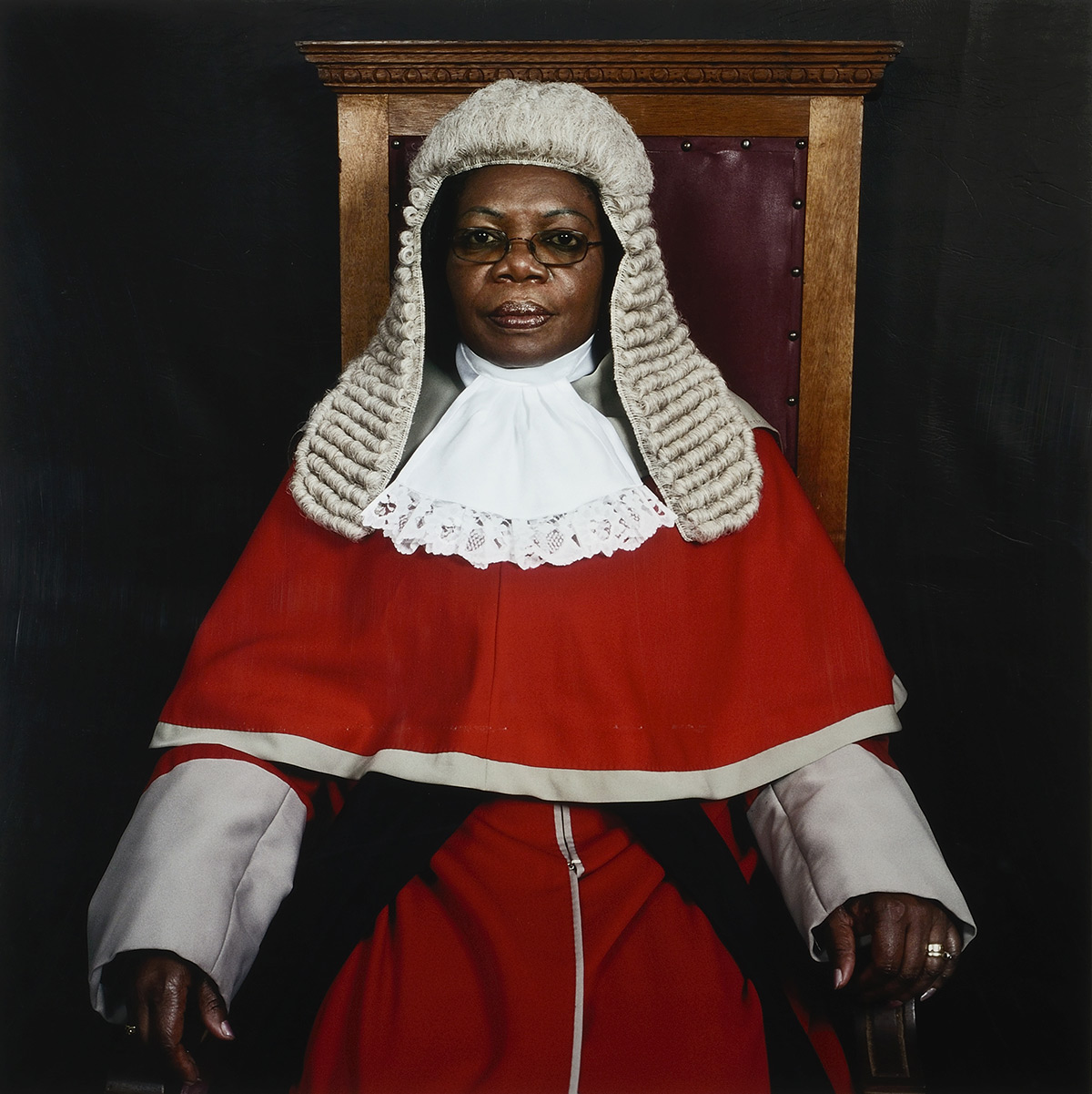 Hugo’s Portrait of the Honorable Justice Julia Sakardie-Mensah highlights the contradictions of personal/cultural identity that may be called into play for an individual occupying a position of public office. To what extent does the judge depicted identify with the white wig she is wearing; a flamboyant masculine symbol of judicial rank that has its origins in late-17th century Europe?
