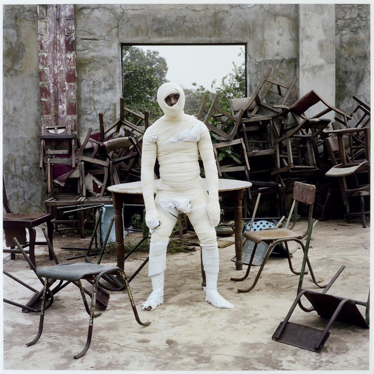 This outlandish image of a zombie-like bandaged figure in a wrecked and abandoned old café or classroom is part of Hugo’s Nollywood (2009) series in which he explores the multilayered reality of the Nigerian film industry. These staged representations feature local actors who recreate themes and characters from Nollywood films: young men in military fatigues; witch doctors, healers and saints; hunters with their kill; prostitutes in their rooms… The result is a series of surreal blurring of fact and fiction.