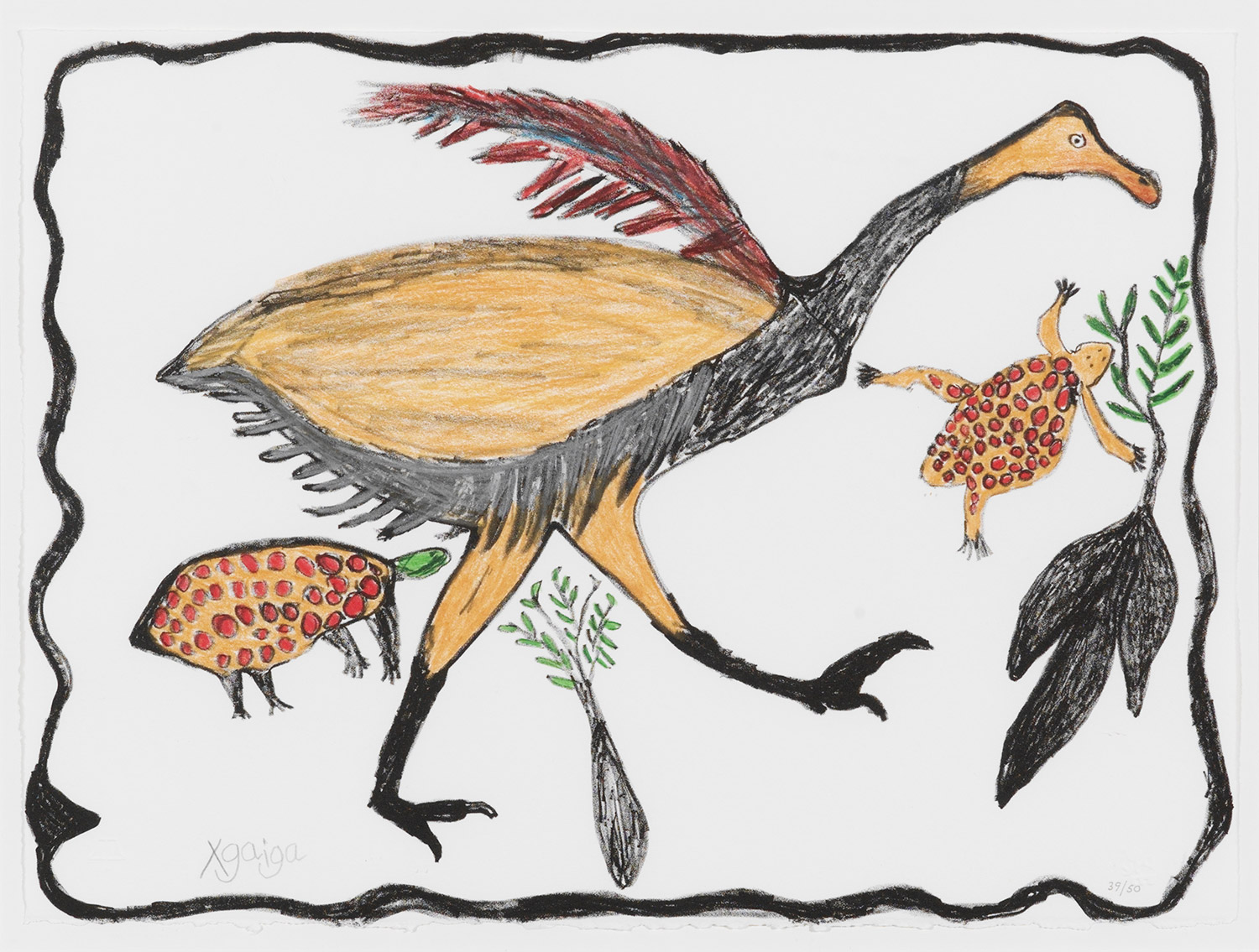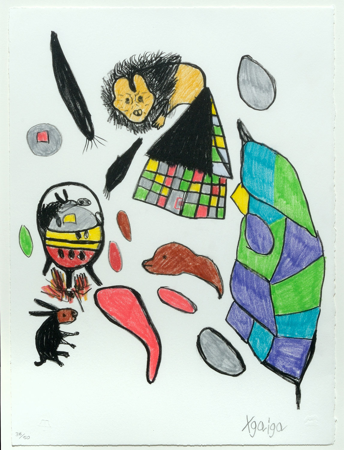 Along with his wife Ncg’abe Taase, Qhomatca was a member of the Kuru Art Project. He joined the art project in 1997, working with oil on canvas, but was soon introduced to the lino printing technique, becoming an expert in colour reduction lino prints.