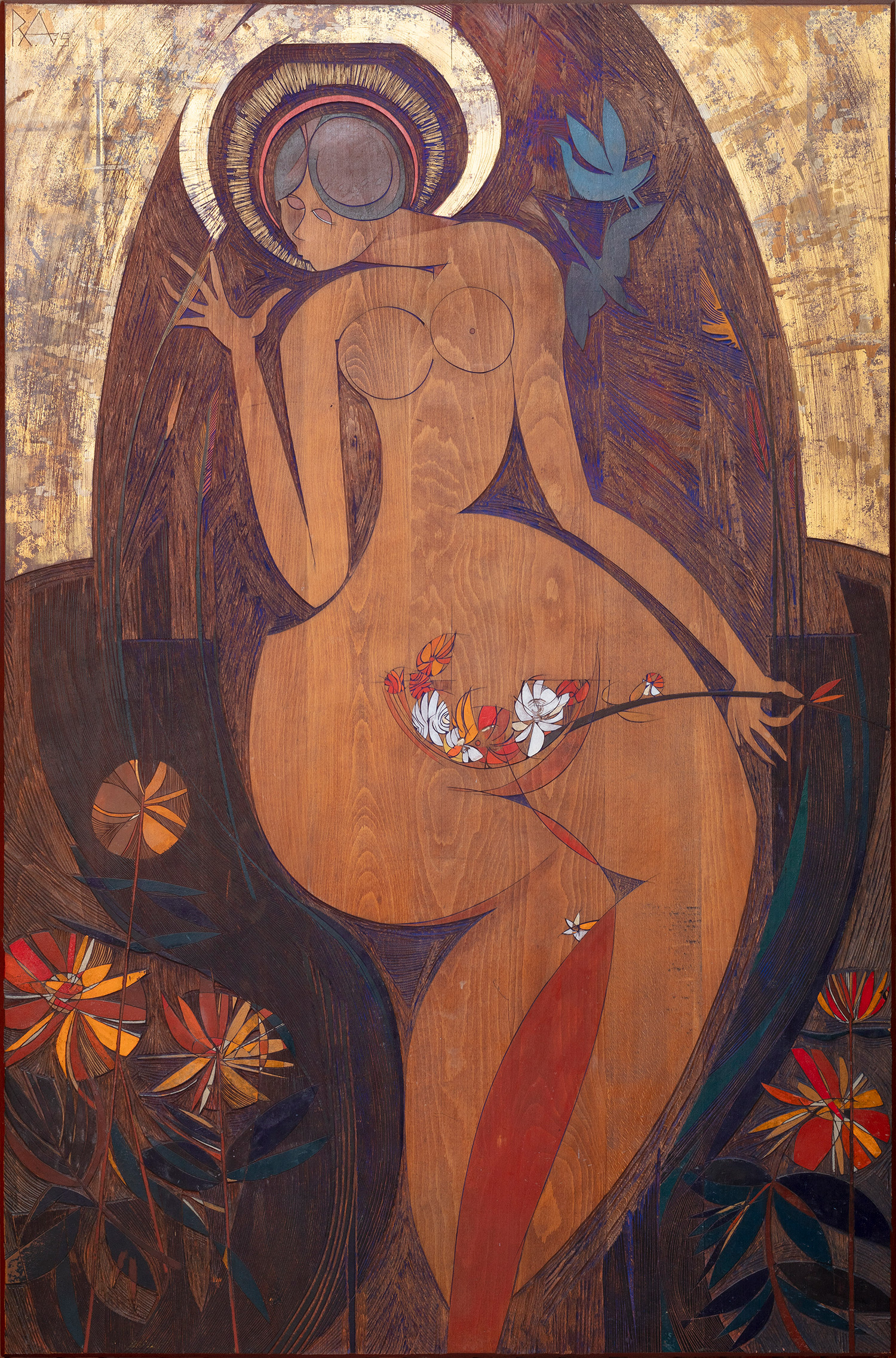 While he has worked in many media, his chosen medium is engraved or incised and painted wooden panels. His subject is humankind, myths and iconic African imagery.