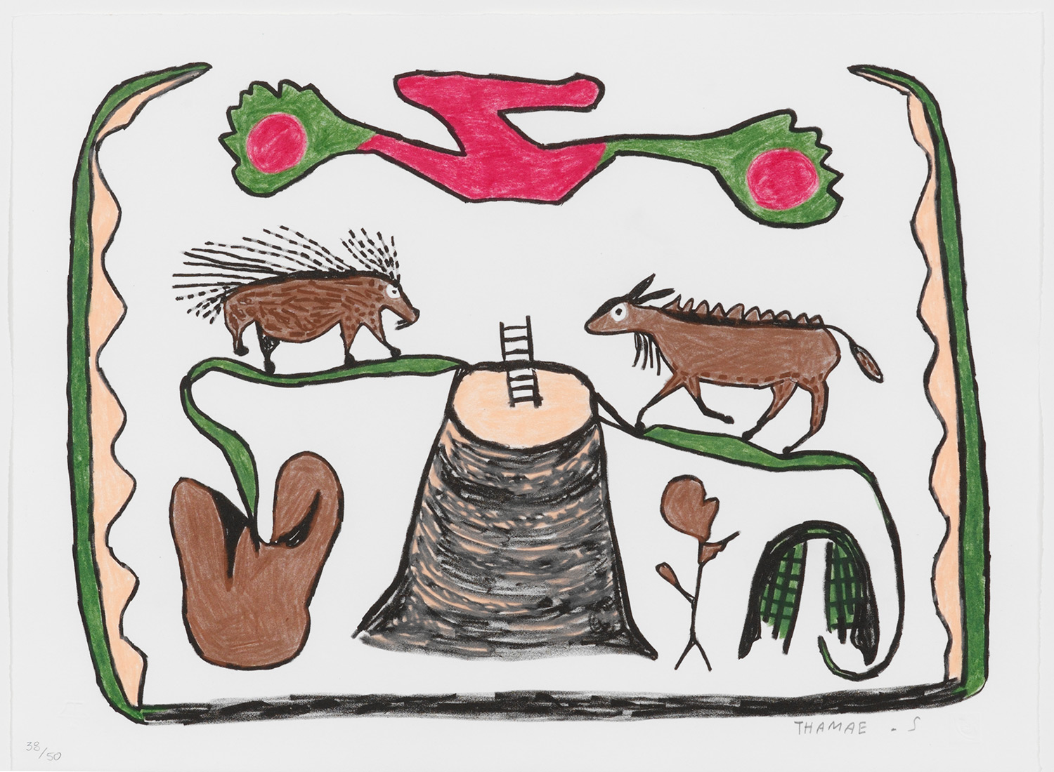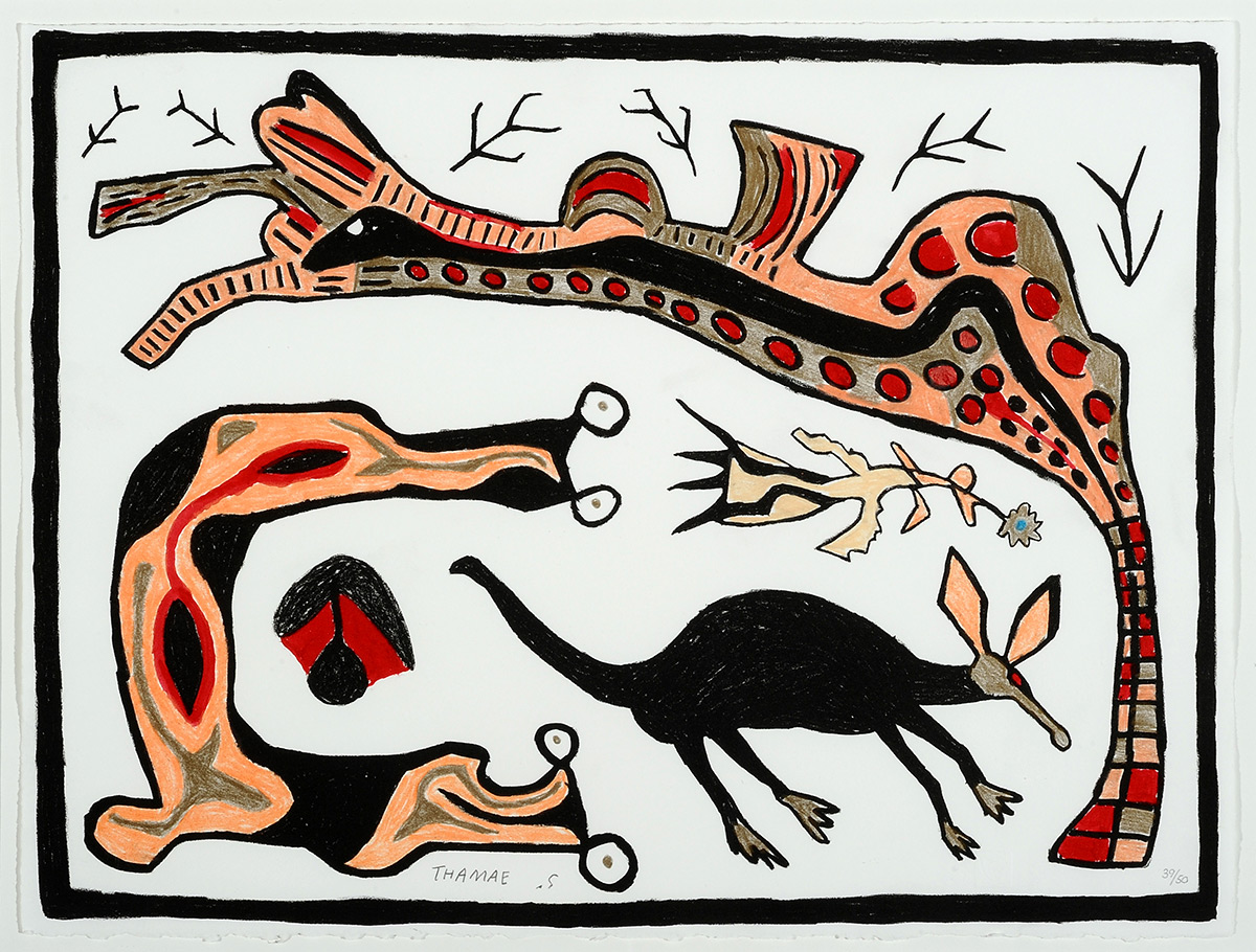 Setshogo worked as a painter and as a woodcarver, but his bold graphic style found its most effective expression in the immediacy of linocut. The animals of the Kalahari Desert were his favorite subject matter. He created his artworks without any visual references, relying on memory to depict many animals that had not been seen for years in the part of the Kalahari where he lived. His distortion of the animals’ forms adds to the expressiveness of his work. San mythology was important to him and he would depict the mythical figures that he grew up hearing about; such as mischievous water creatures that appear in abundance after good rains have filled the desert pans.