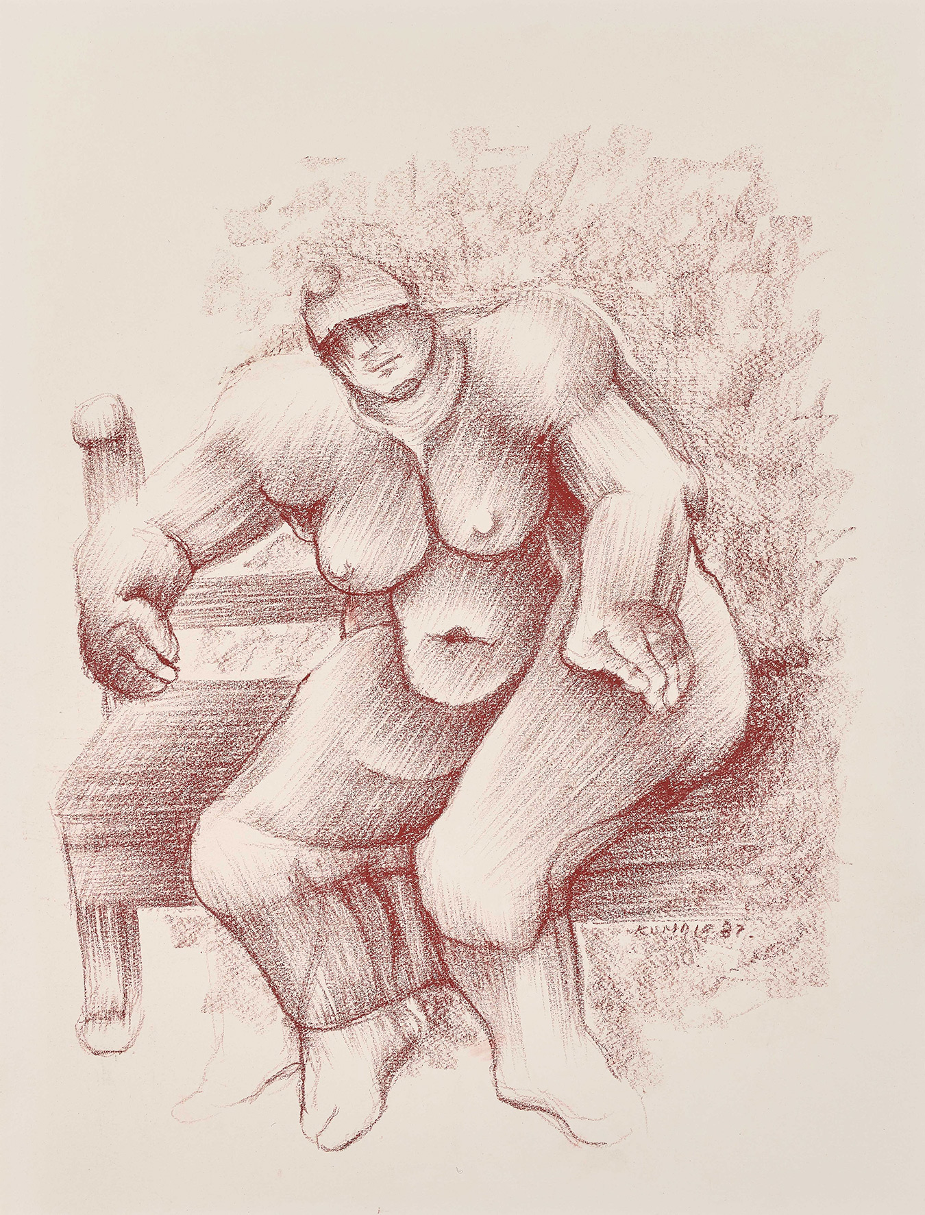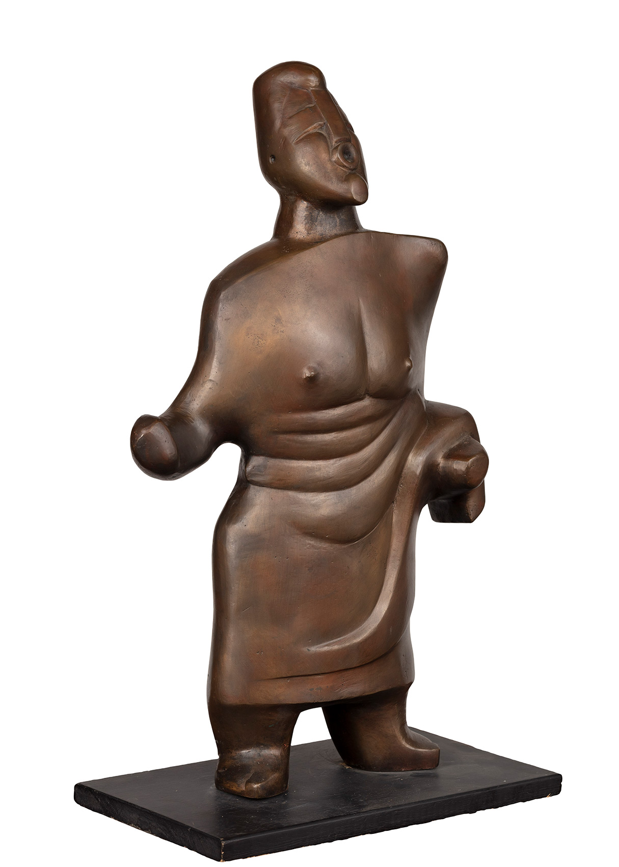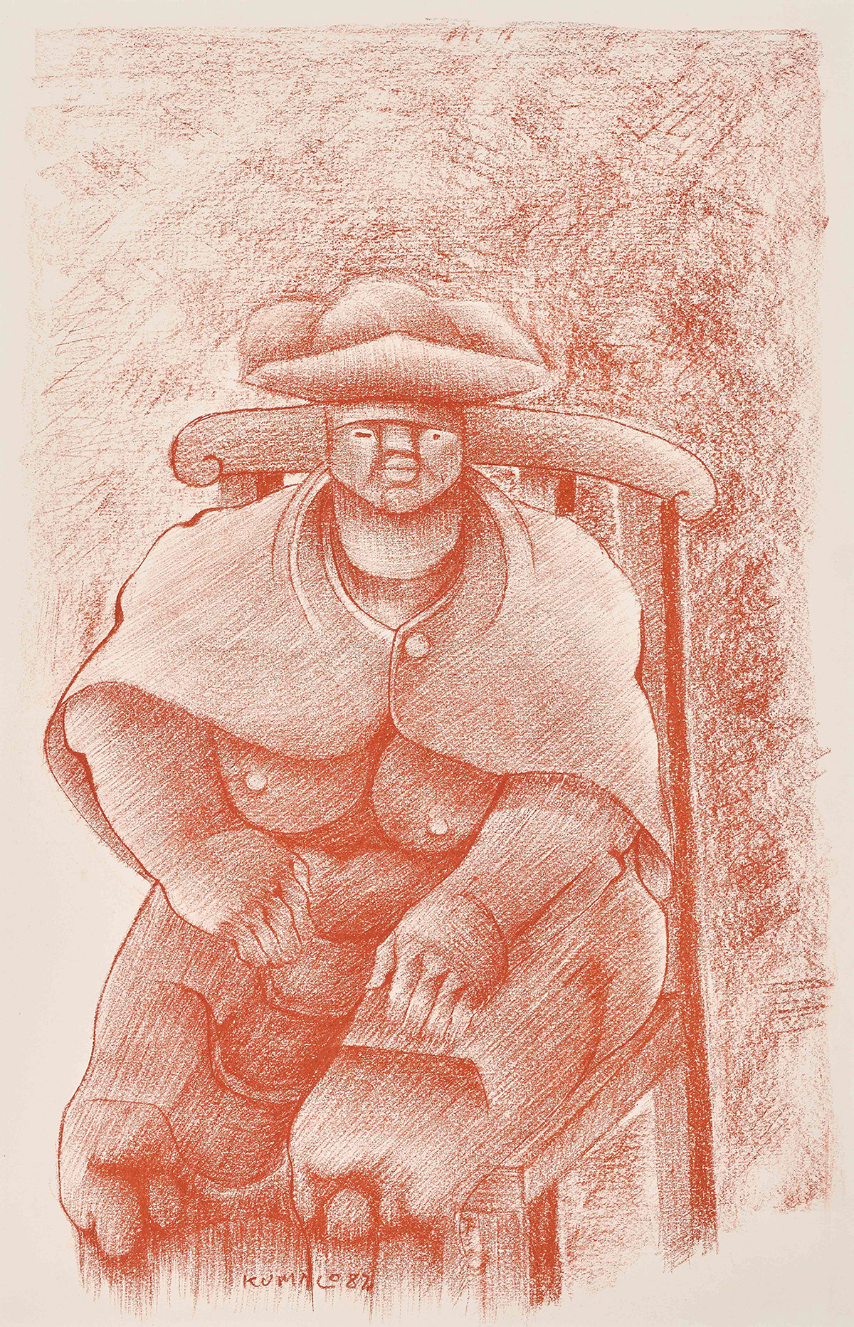 He went to school at Madibane High in Diepkloof, Soweto after black people were forcibly removed from Sophiatown, and he later studied at the Polly Street Art Centre, where he was mentored by Cecil Skotnes and honed his skills in sculpture and drawing. The gallery owner Egon Guenther, who visited the Polly Street Art Centre from time to time, showed the artists there images of sculptures and drawings by the German artists Ernest Barlach and Kathe Kollwitz, which served as inspiration for the stylised representations in Kumalo’s work.