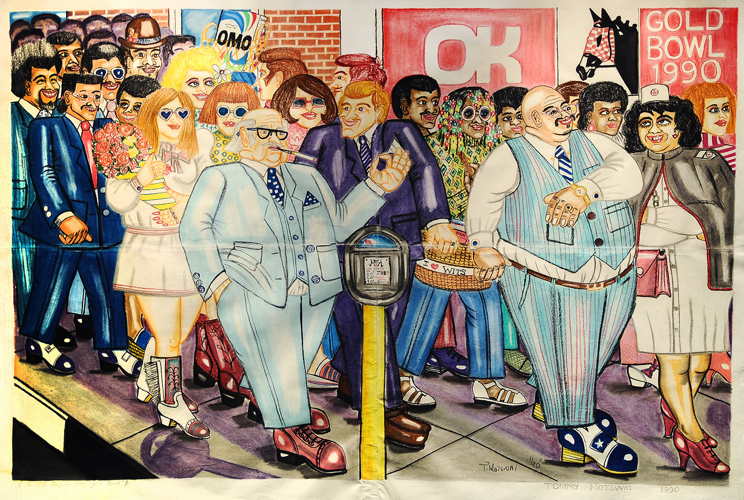Motswai works in pastel and various graphic media. His work is in major public and private collections throughout South Africa, including those of the Johannesburg Art Gallery, SA National Gallery, the University of South Africa and the SABC. In 1994 Motswai was commissioned by French Vogue to do an illustration for the cover of the magazine that celebrated South Africa’s first democratic elections.