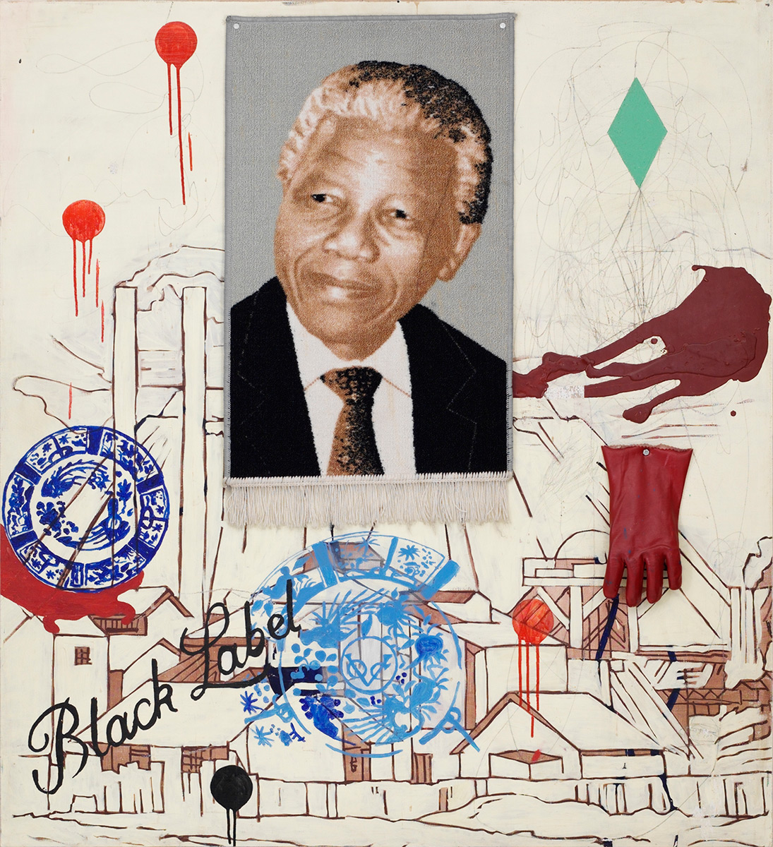 In the early 1990s, Barker started an investigation that would span over two decades, recreating Afrikaner nationalist landscape artist JH Pierneef’s (1886–1957) landscapes and introducing neon dots, splatters of lacquer paint, overlaid images and other elements to them to elaborate on issues surrounding land, freedom and desire in his own time.