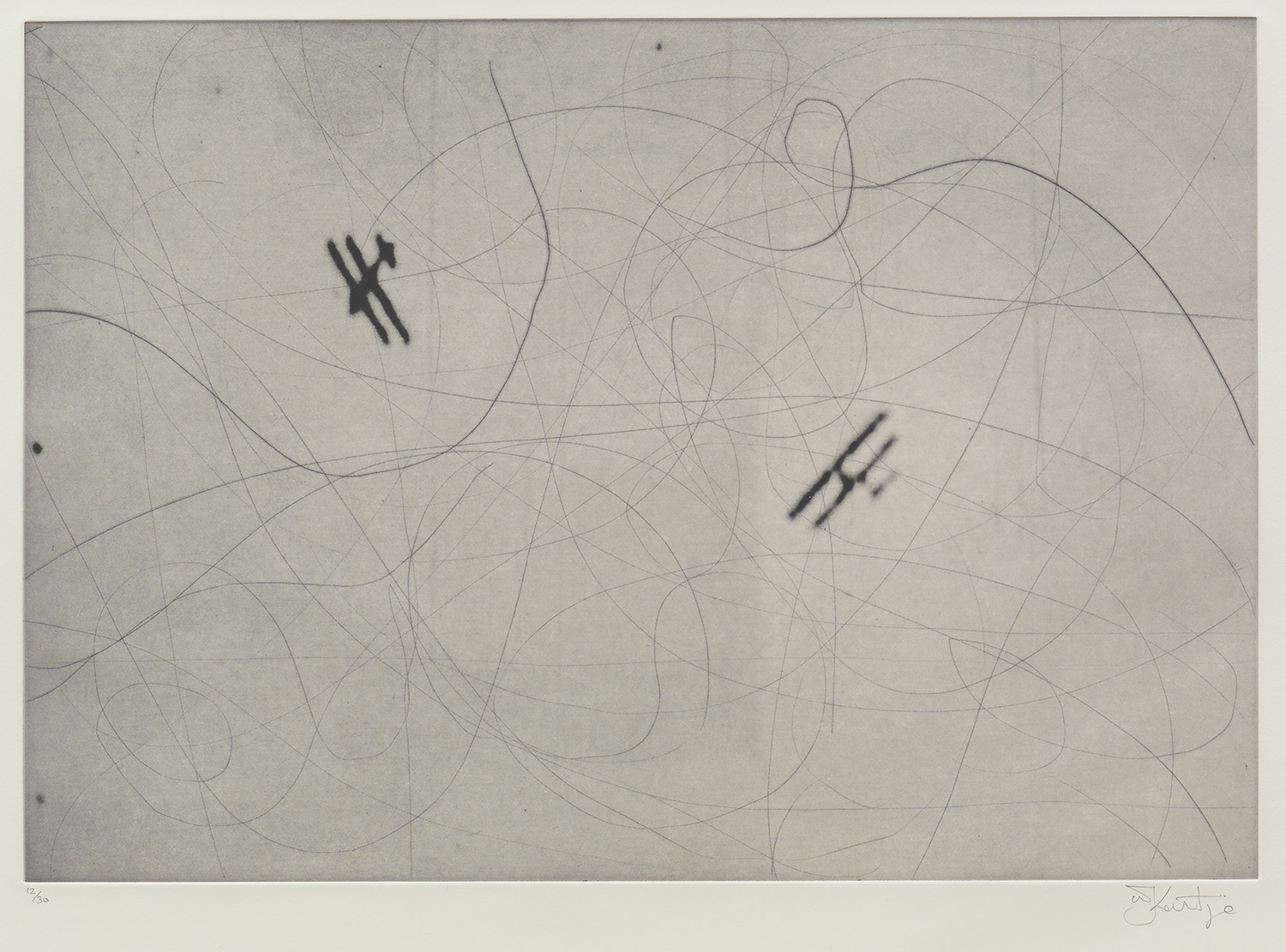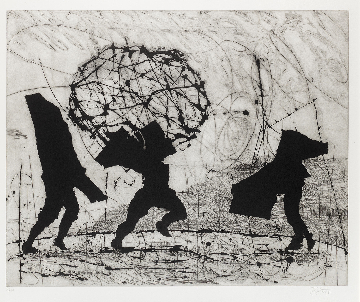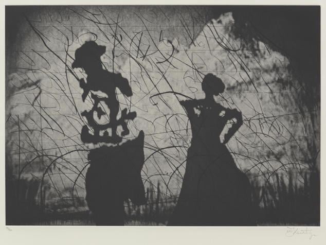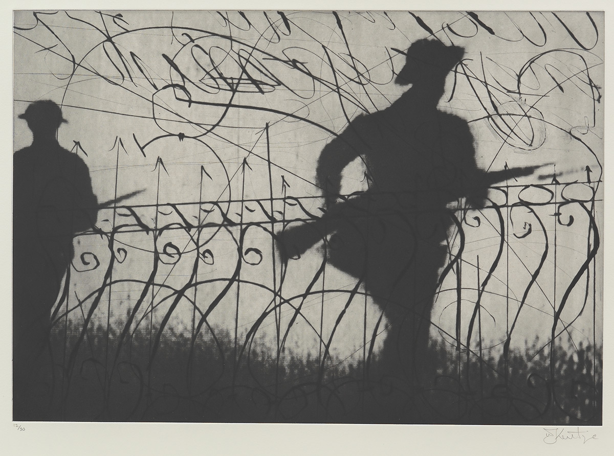 This etching draws on Kentridge’s sustained experiments in shadow theatre – for years he has deployed shadow figures or dark silhouettes ripped from construction paper and collaged against the patterns of 19th-century atlas maps.