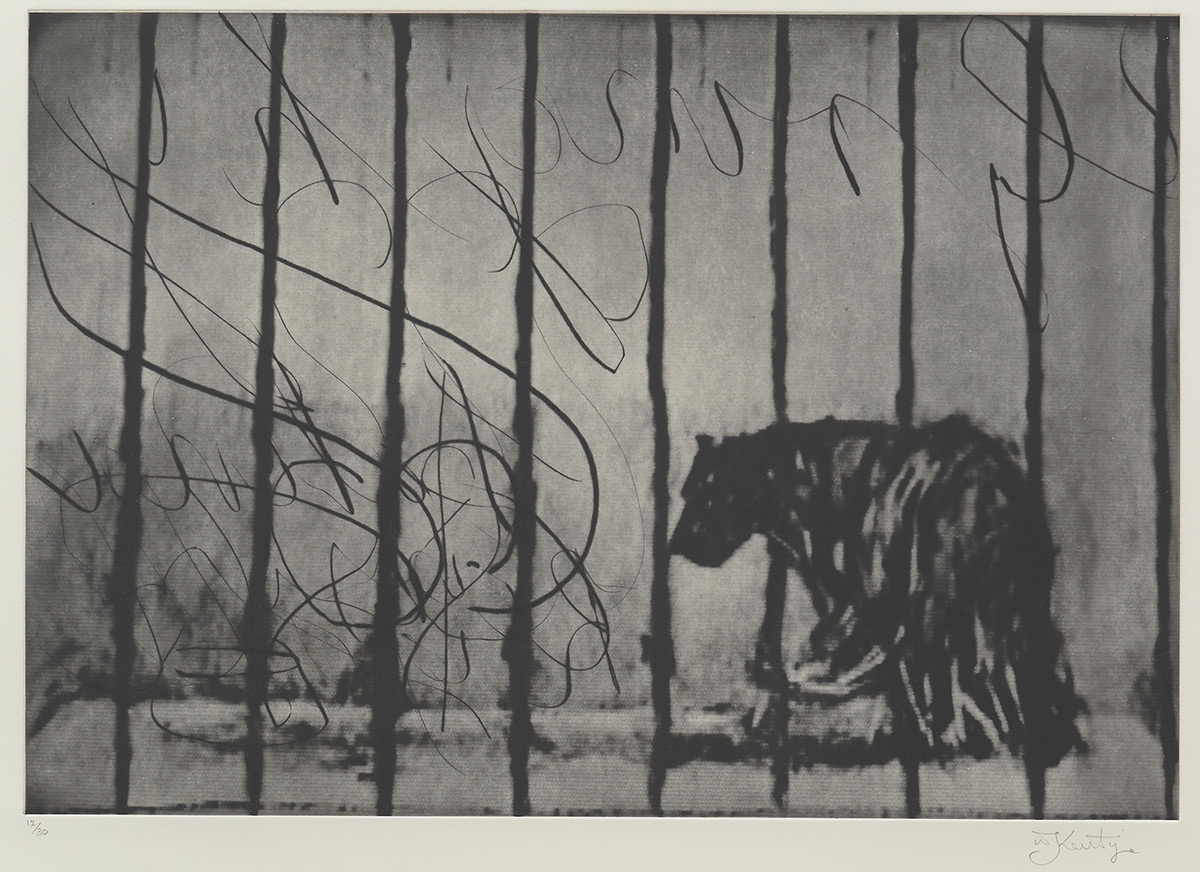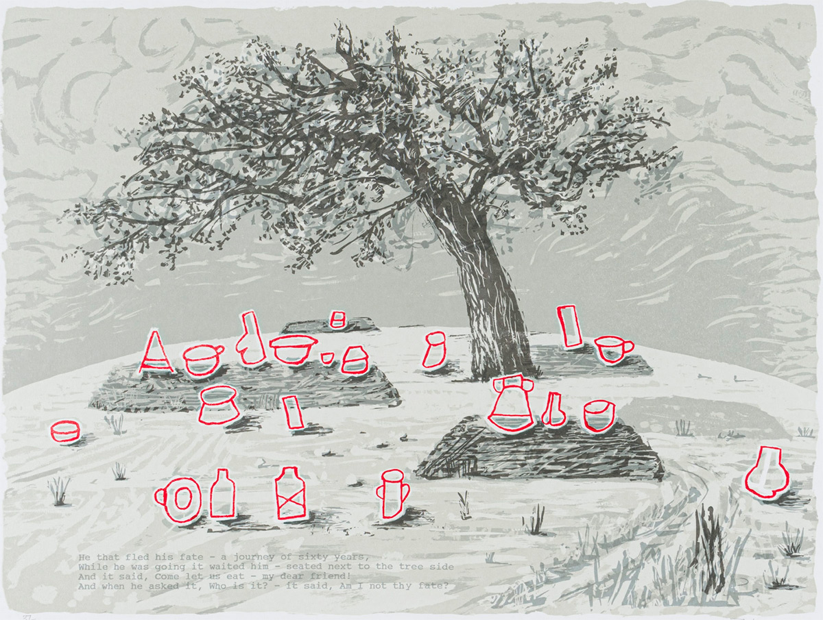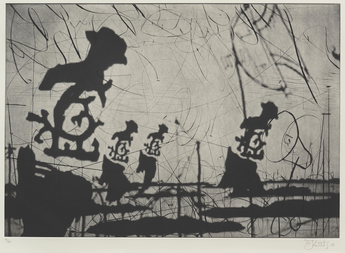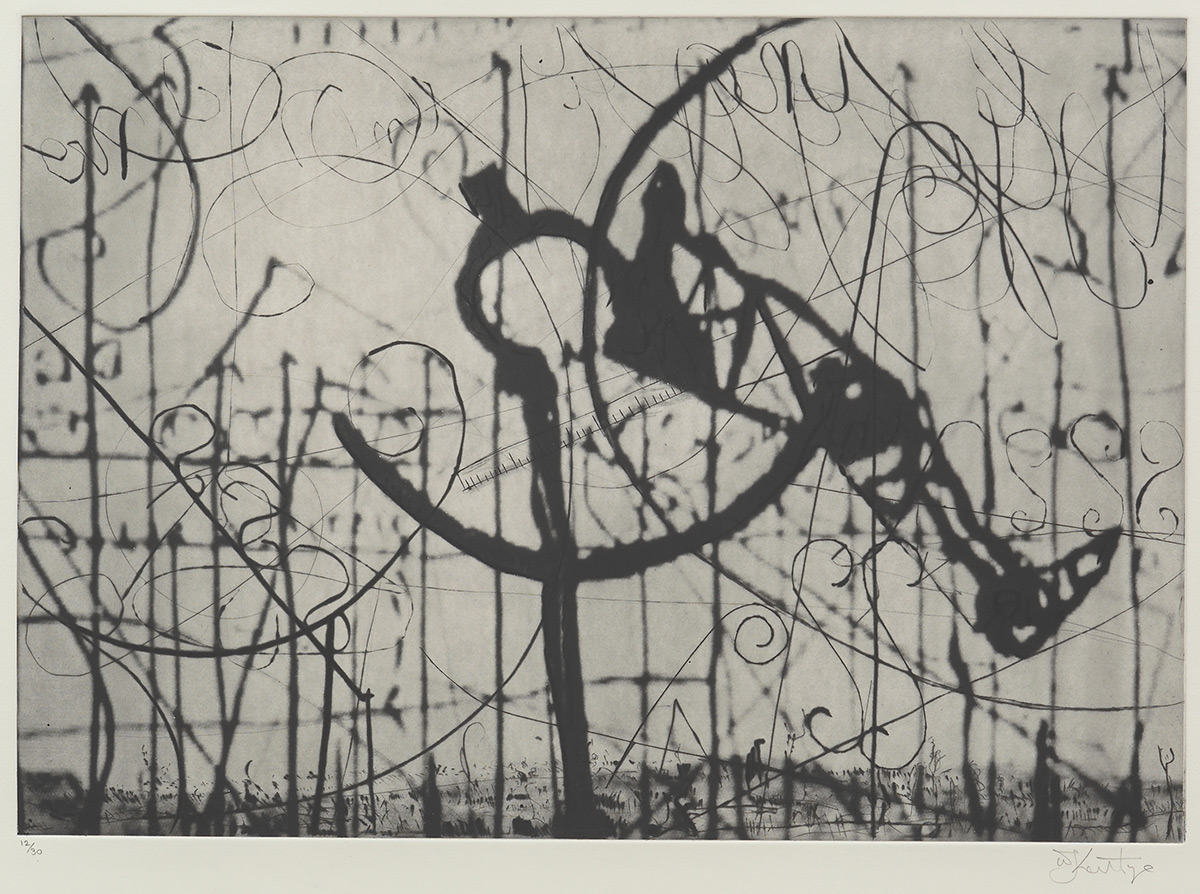 This etching draws on Kentridge’s sustained experiments in shadow theatre – for years he has deployed shadow figures or dark silhouettes ripped from construction paper and collaged against the patterns of 19th-century atlas maps.